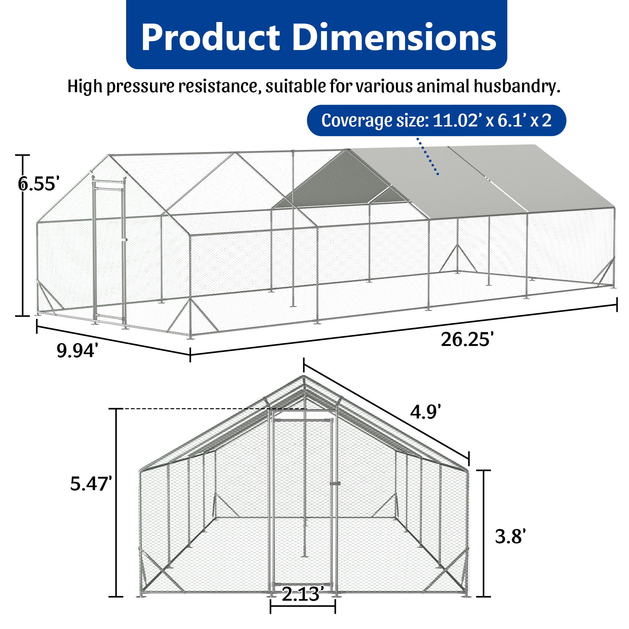 Product Name:Large Metal Chicken Coop, Walk-in Chicken Run,Galvanized Wire Poultry Chicken Hen Pen Cage, Rabbits Duck Cages with Waterproof and Anti-Ultraviolet Cover for Outside(10' L x 26 W x 6.56' H)