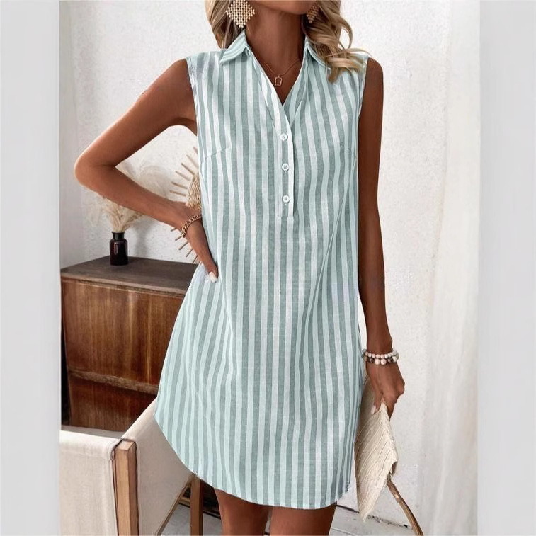Minimalist Sleeveless V-neck Buttons Striped Shirt Dress