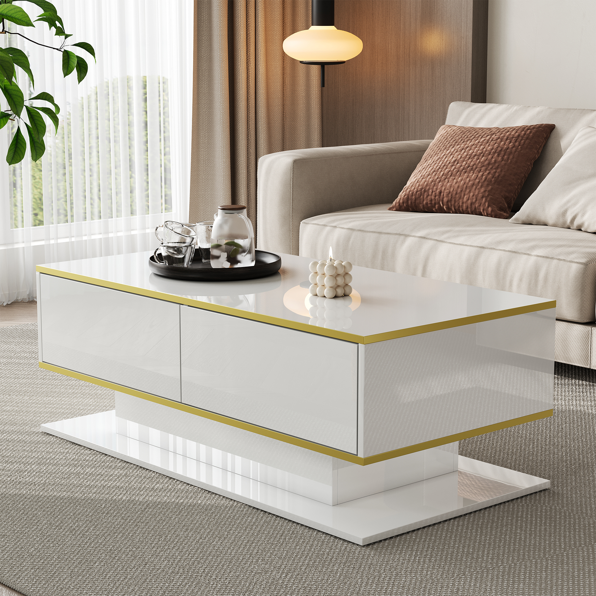 This modern coffee table has become the focal point of the living room with its unique design concept that perfectly combines practical functionality with artistic beauty. The spacious tabletop (100 × 50 × 40 cm) provides plenty of room for coffee essentials, decorations, or books and magazines. The high-gloss surface reflects attractive light and shadow effects, complemented by exquisite gold decorative lines that add a touch of luxury to any space. The specially designed LED ambient light strip allows for multi-color selection and stepless brightness adjustment. You can freely switch lighting effects according to your mood, creating a warm and romantic atmosphere or a modern, dynamic living environment. Three drawers and open compartments offer storage for remote controls, snacks, and small items, helping to keep the living room clean and organized. This coffee table combines aesthetics and functionality, adding the finishing touch to modern