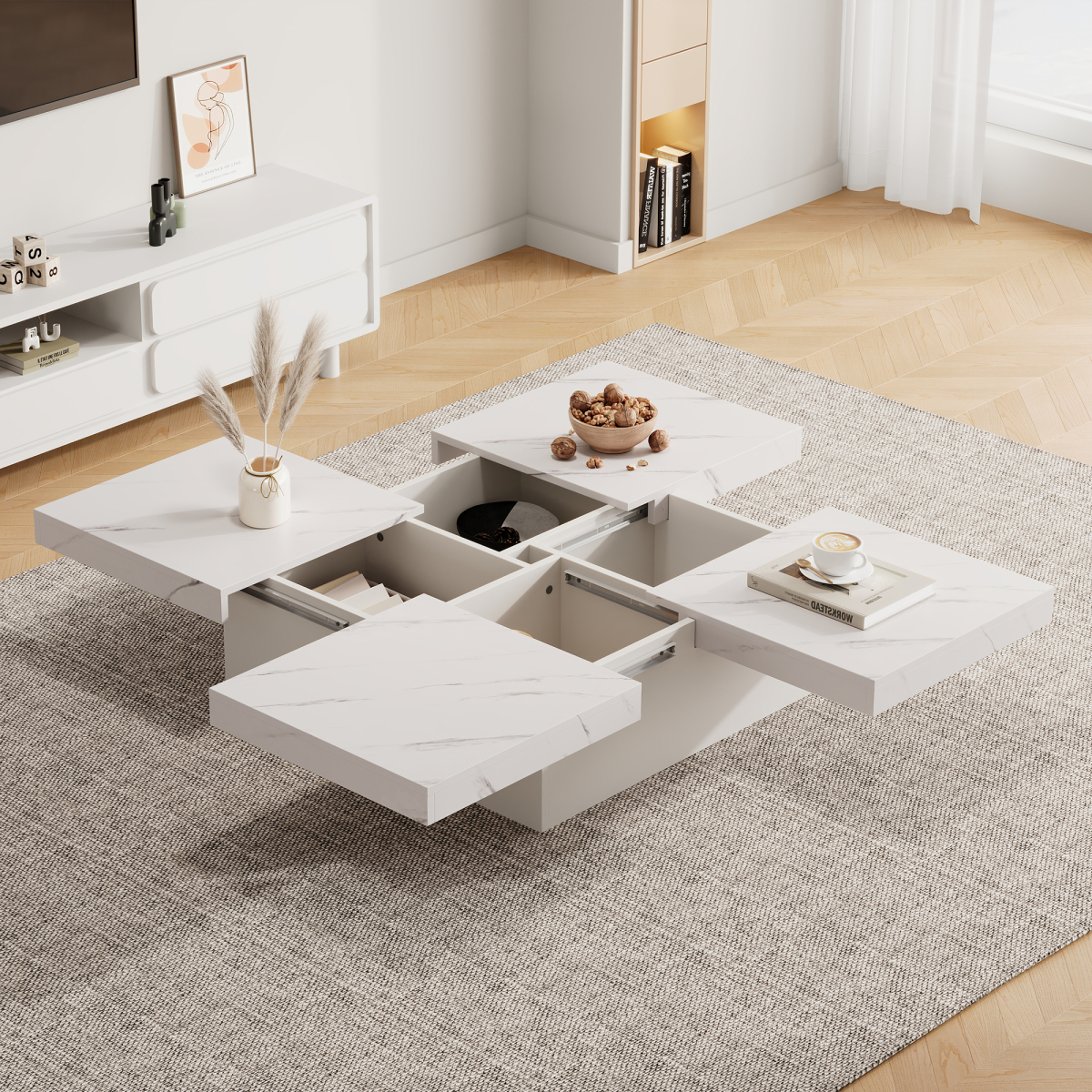 Modern Square Coffee Table With Marble Look, Centre Tea Table With 4 Sliding Drawers, Coffee End Table, 90 X 90 X 25 Cm, For Livingroom Office, White