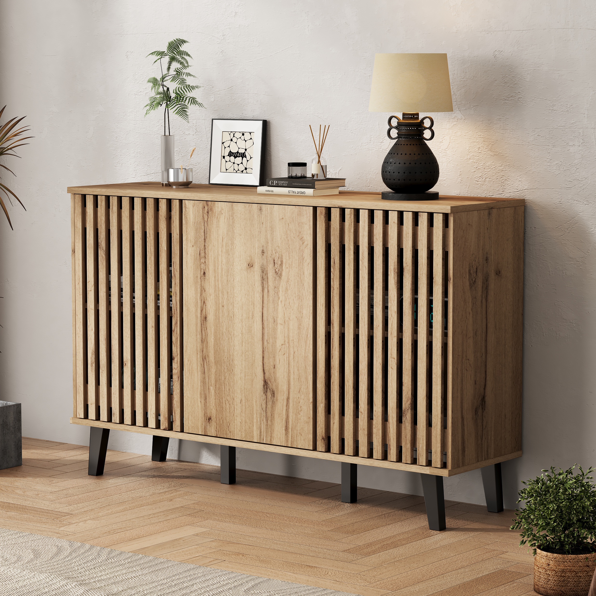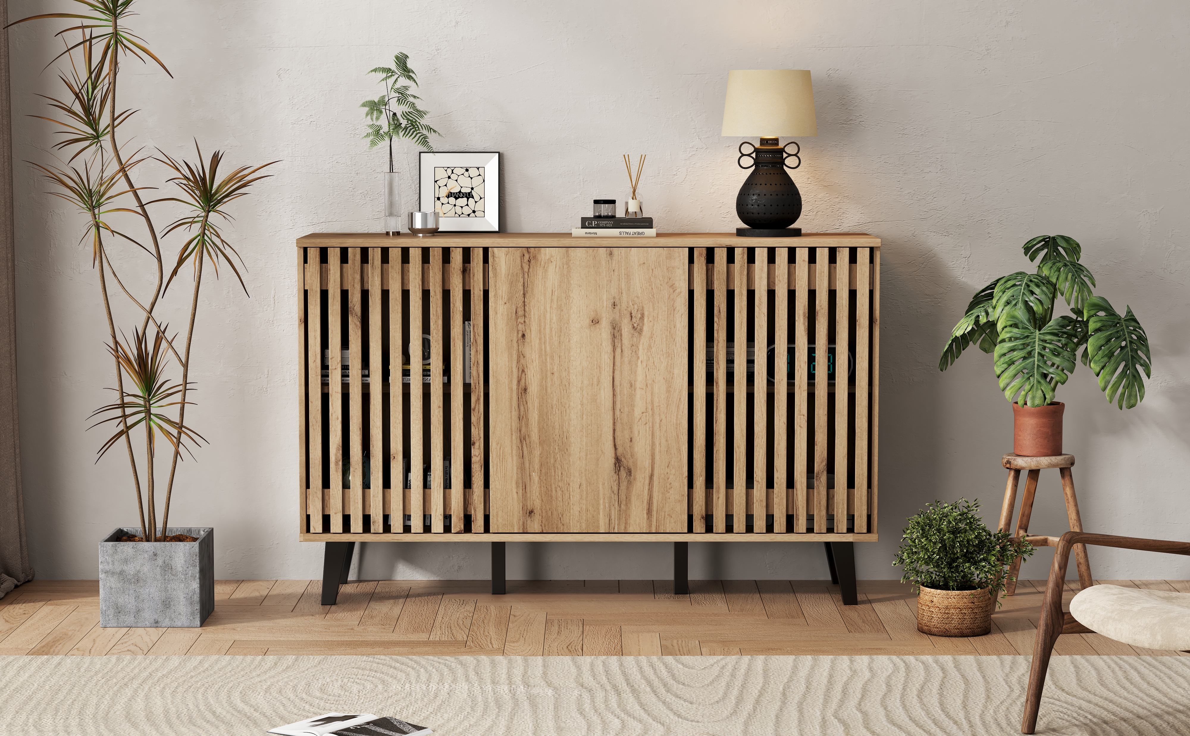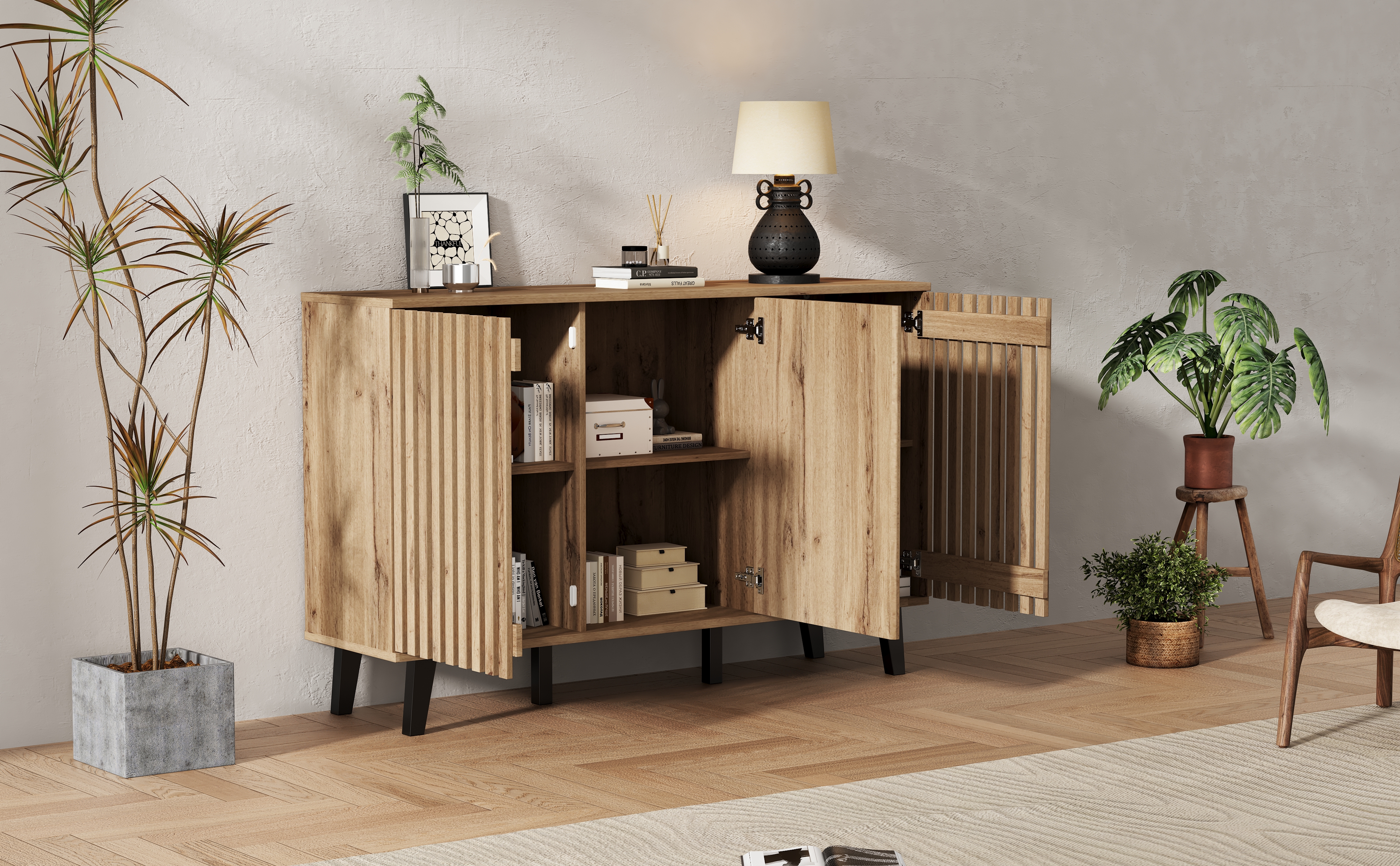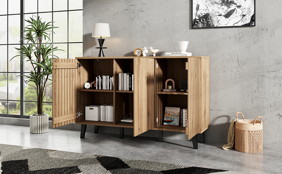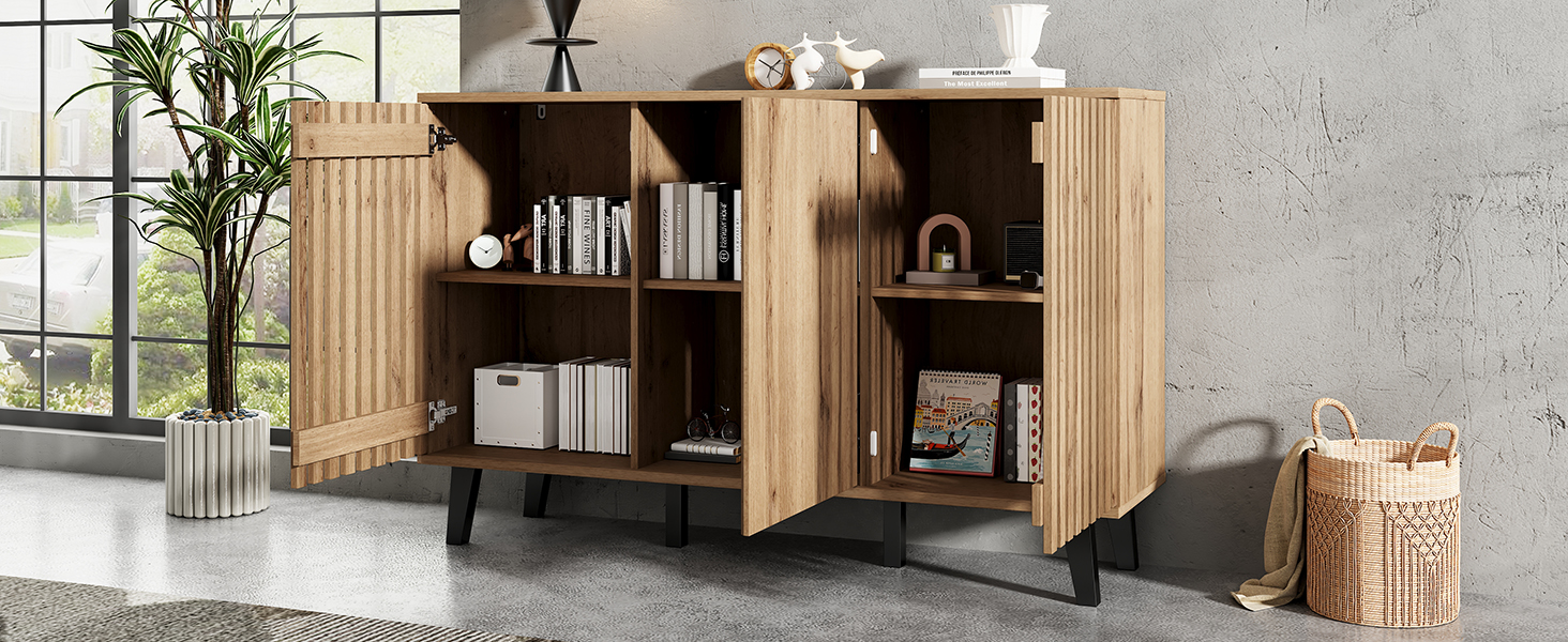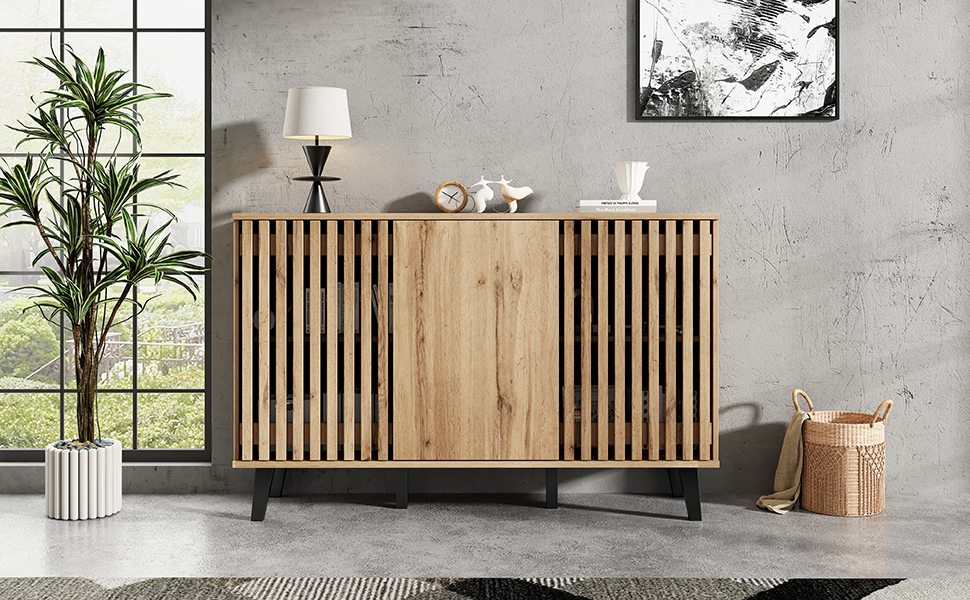• Innovative Hybrid Cabinet Door Design: The unique design features two hollow wooden cabinet doors and one solid wood door. The hollow sections can be used to display decorative items or plants. When the cabinet doors are closed, they conveniently conceal clutter, combining aesthetics and practicality for a more flexible and diverse storage solution.