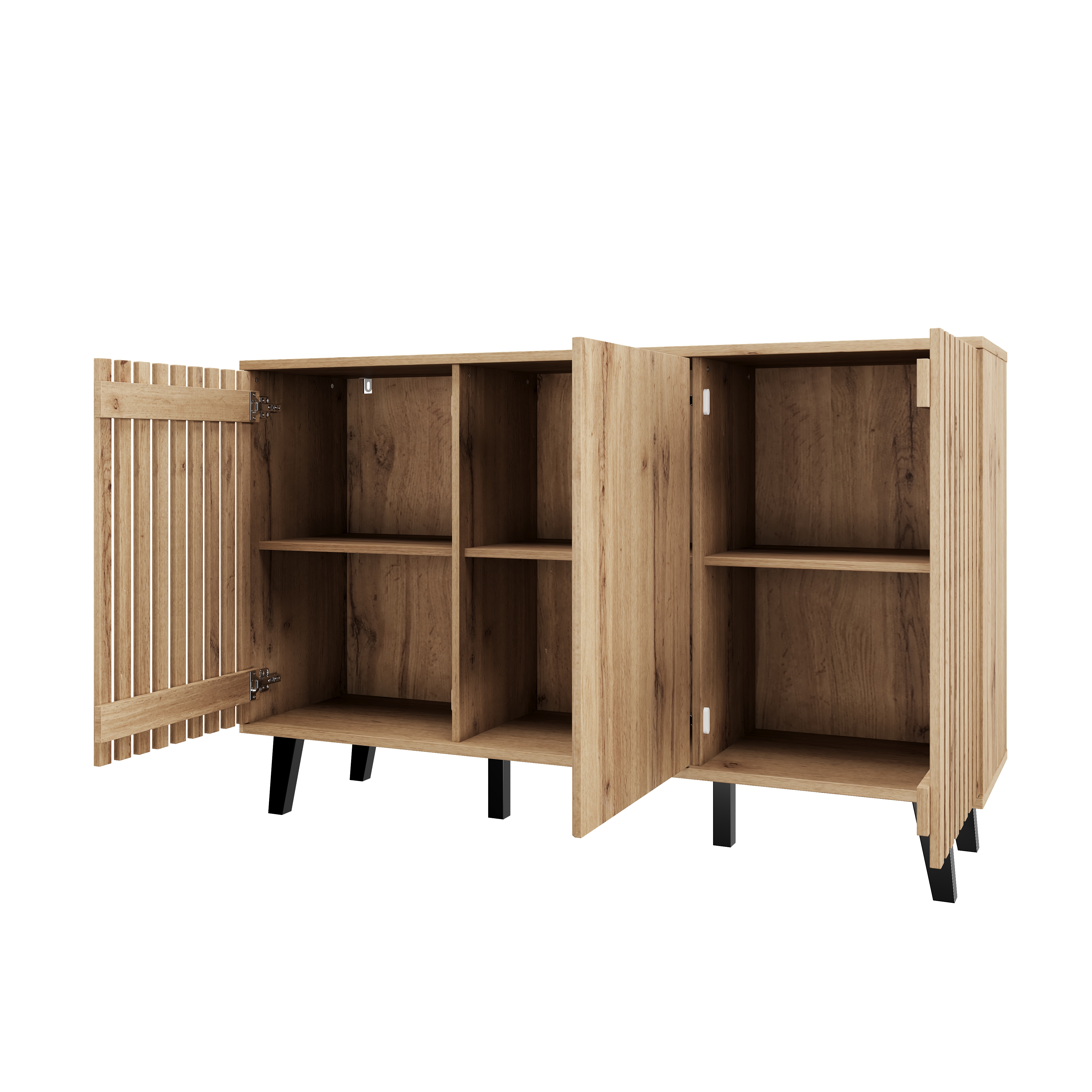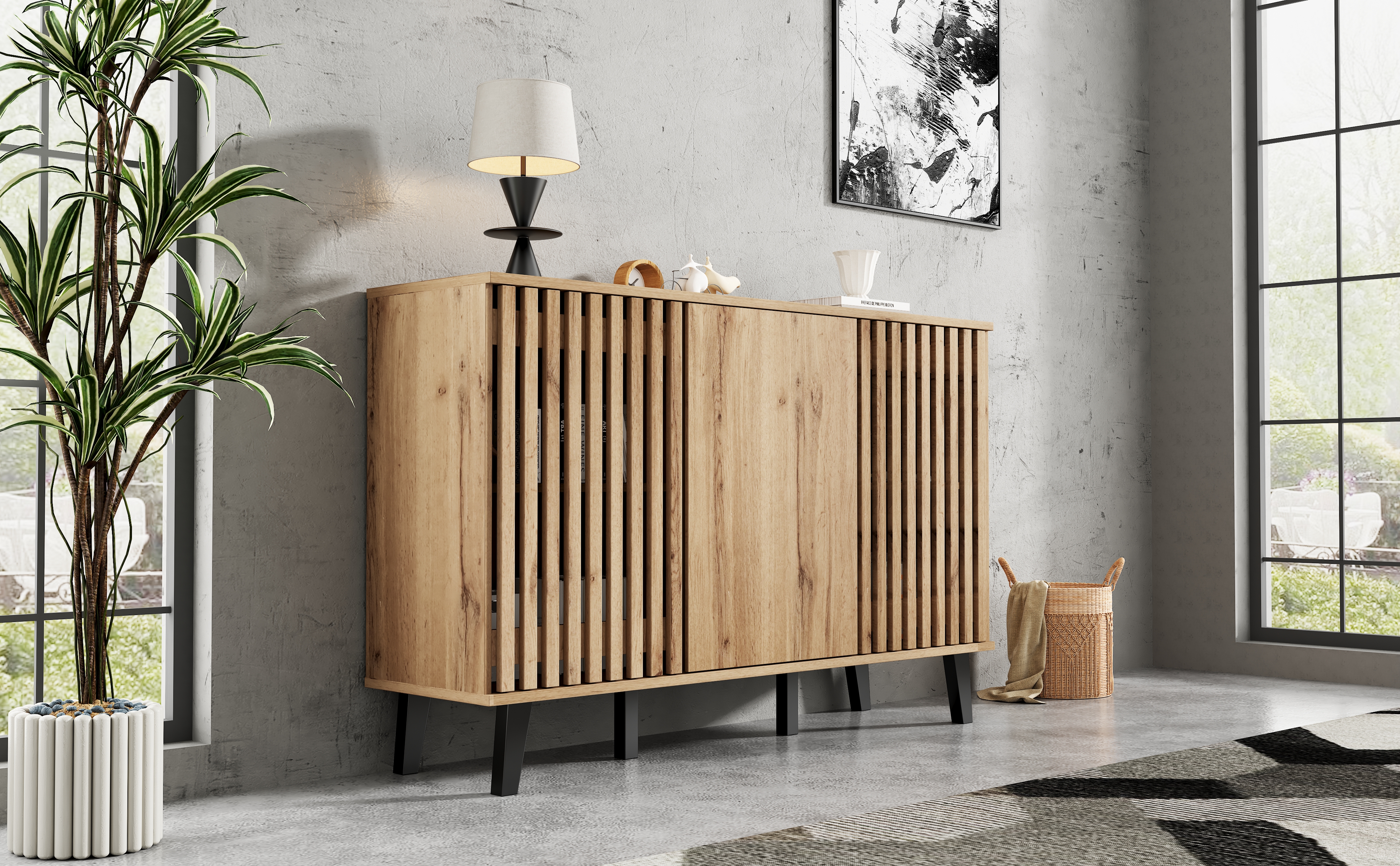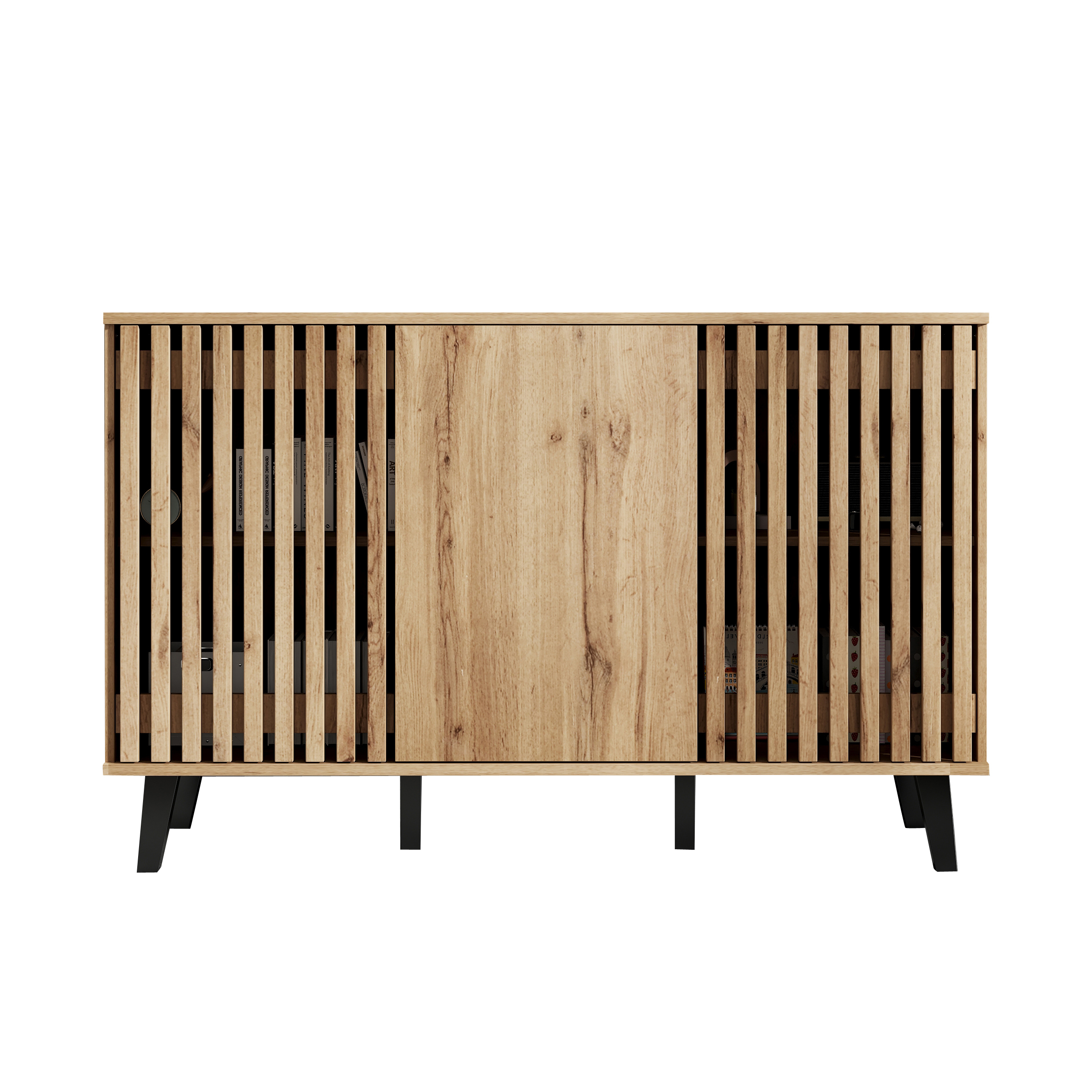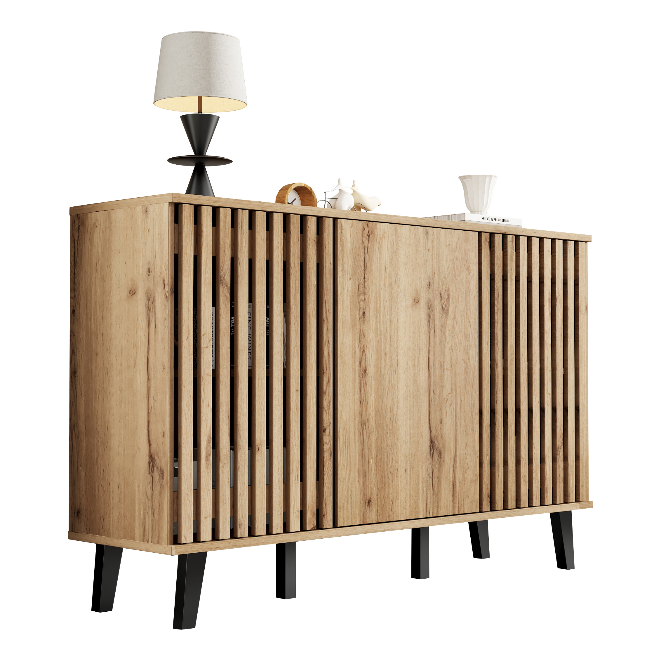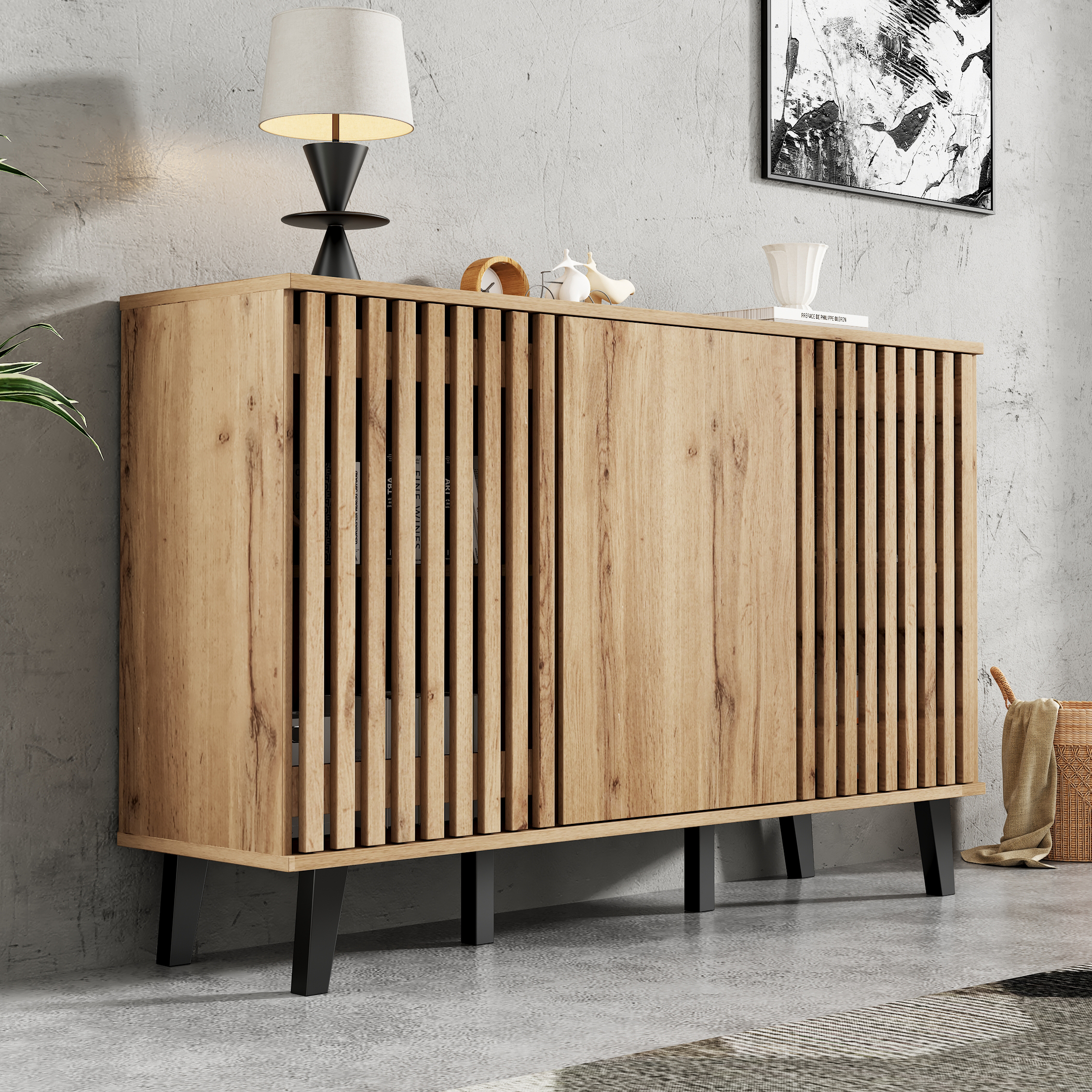• Innovative Hybrid Cabinet Door Design: The unique design features two hollow wooden cabinet doors and one solid wood door. The hollow sections can be used to display decorative items or plants. When the cabinet doors are closed, they conveniently conceal clutter, combining aesthetics and practicality for a more flexible and diverse storage solution.