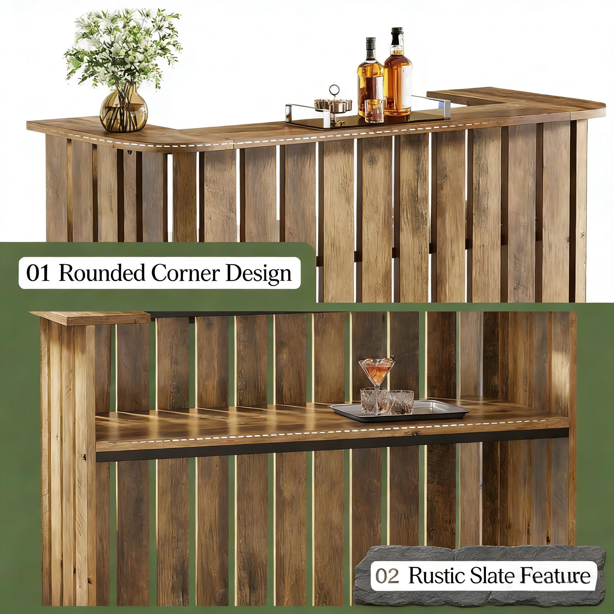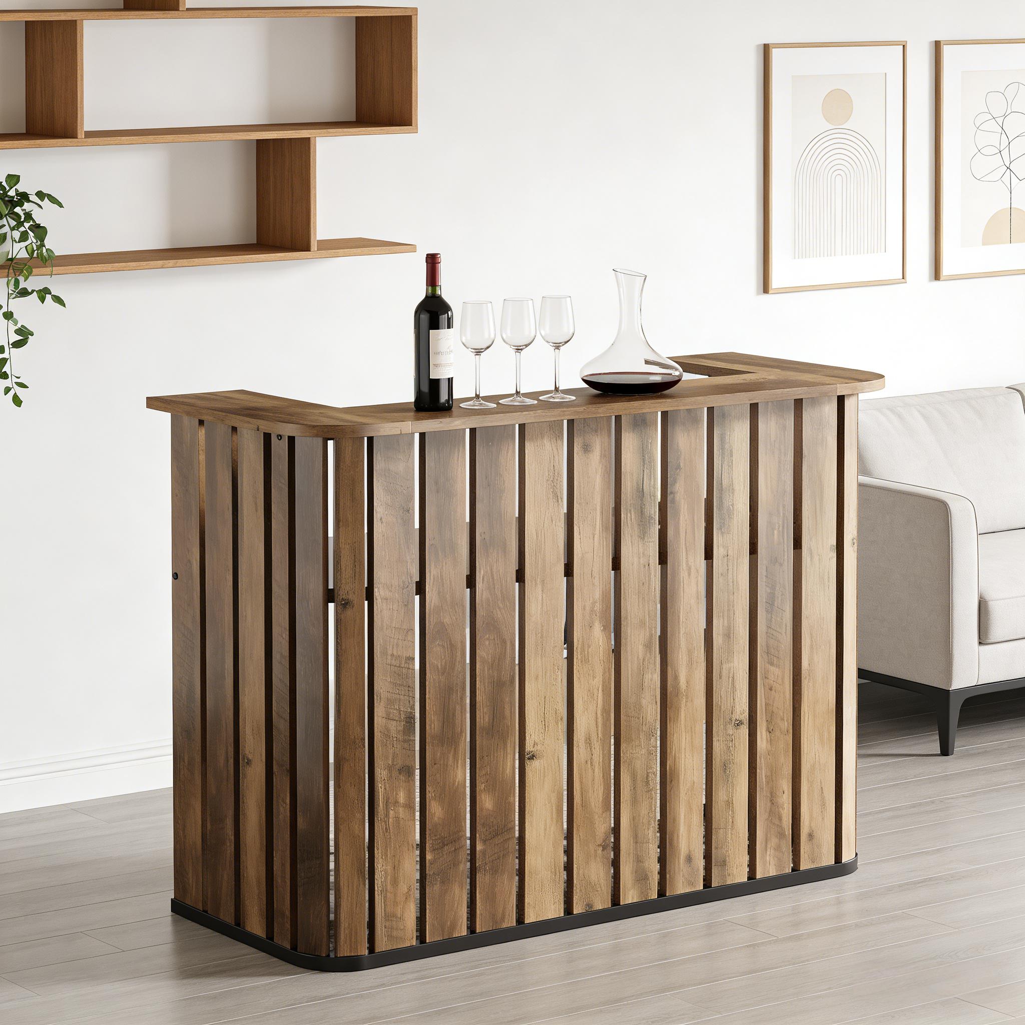 Important Reminder!!! 1) Attention: All products in our store do not support Canada self pickup ordering. Please do not create shipping labels for Canada. Our American products do not support self pickup to Canada 2)We do not ship to Alaska, Hawaii, US protectorates (e.g., Puerto Rico), P.O. boxes, or APO/FPO addresse 3)We don’t accept non-defective remorse returns Charming Farmhouse Bar Table - Invite country charm to your space with our farmhouse-style bar table. Its classic brown finish and slat-joint design enhance any setting. Functional Design - The table's unique U-shaped top is perfect for hosting friends and enjoying drinks. Inside, there's ample space for storing wines and glasses. Versatile and Stylish - Ideal for home wine-tasting areas, restaurants, bars, and cellars, this elegantly designed bar table fits seamlessly into various interiors. Premium Build - Made from high-quality MDF and reinforced with metal brackets, the table is sturdy and durable. Its U-shaped frame ensures excellent load-bearing capacity. Hassle-Free Assembly - All installation tools and instructions are included for easy assembly. For any questions, our after-sales team is always ready to help.