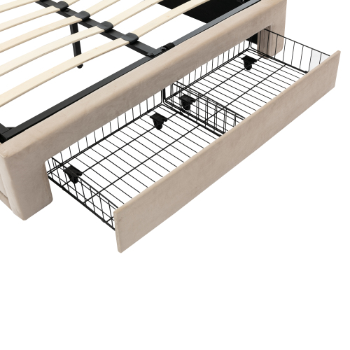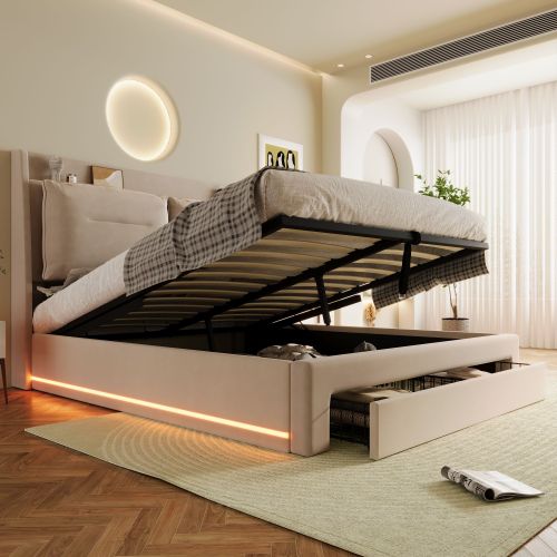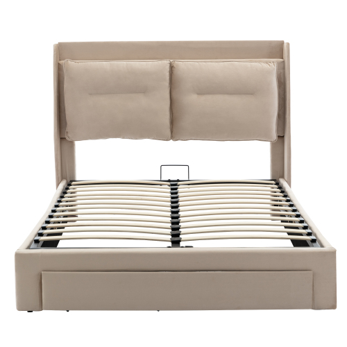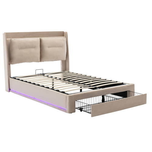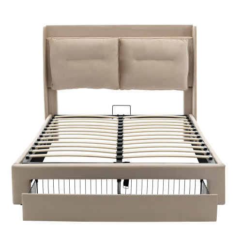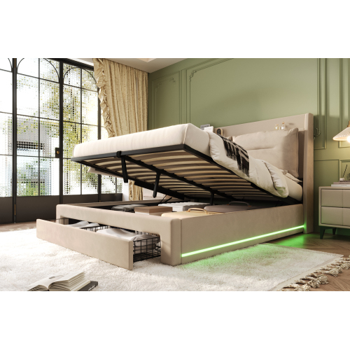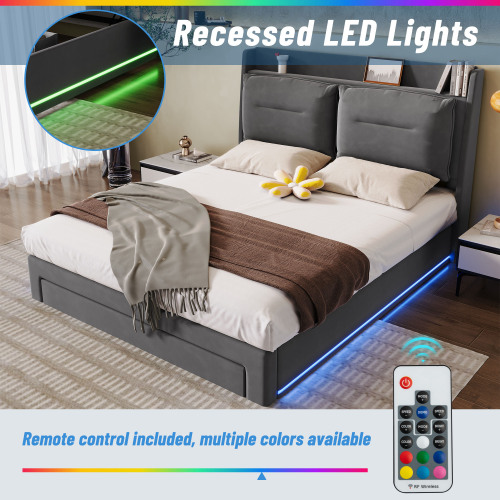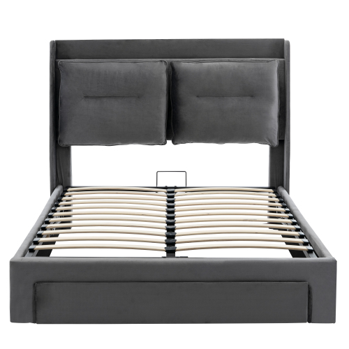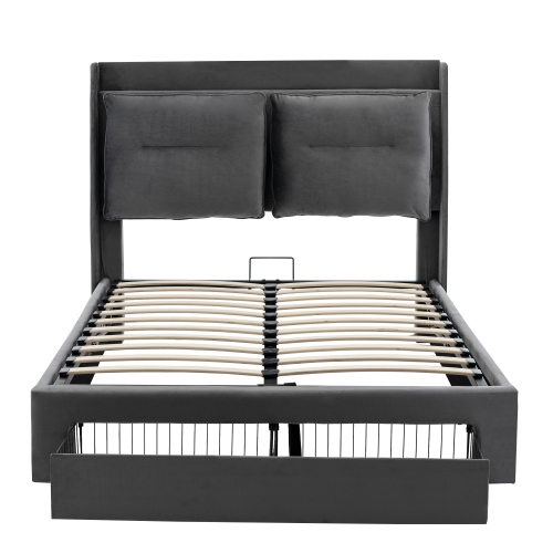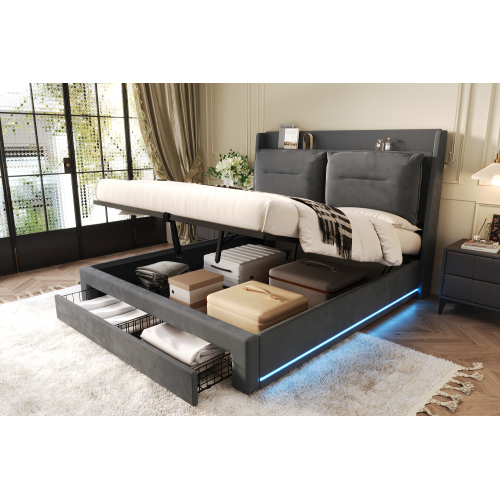 Product Name:Upholstered bed, 150*200(5ft),King Size Bed, hydraulic bed, 2-in-1 storage drawers at the end of the bed, recessed LED light strips on both sides of the bed, slatted frame, Velvet,Dark gray