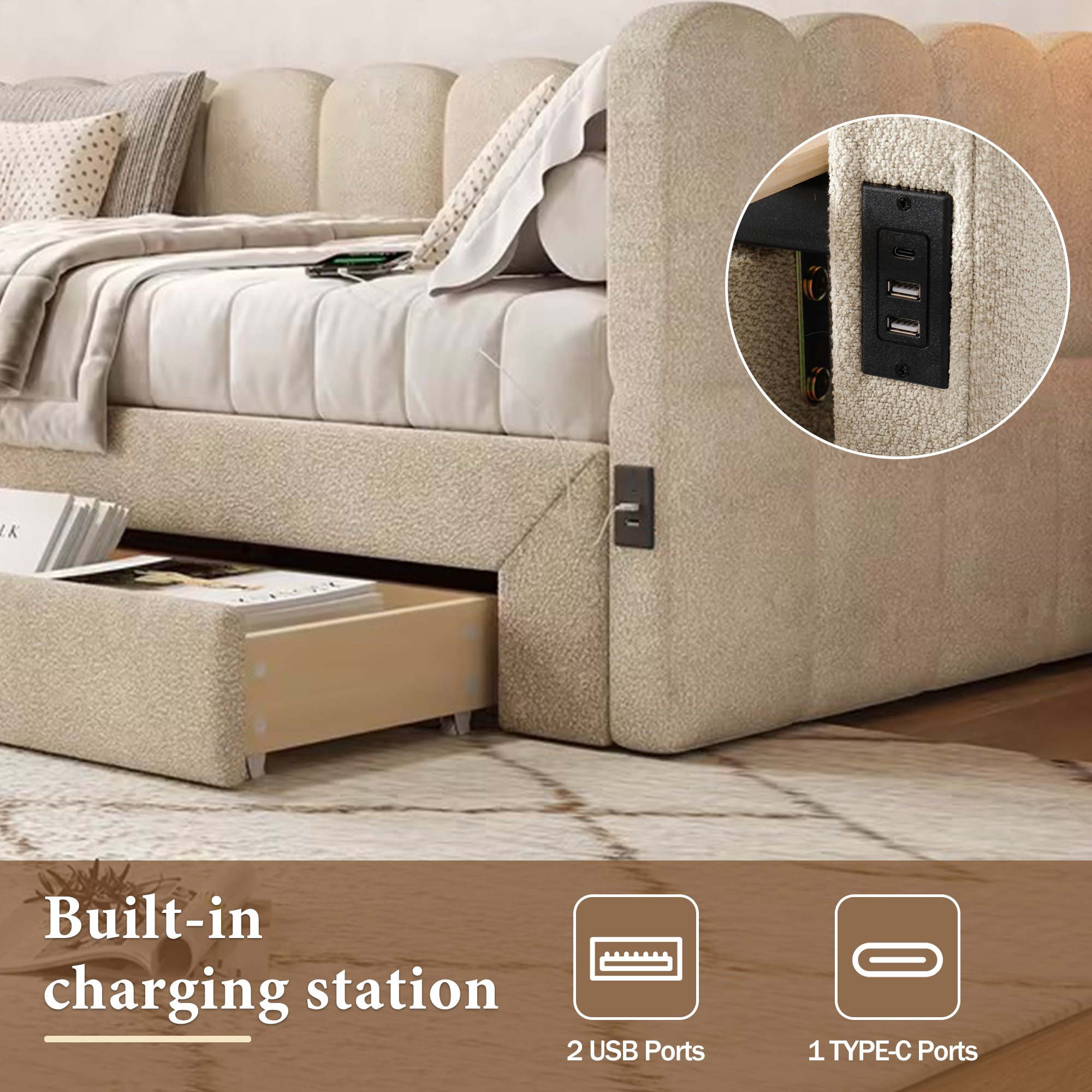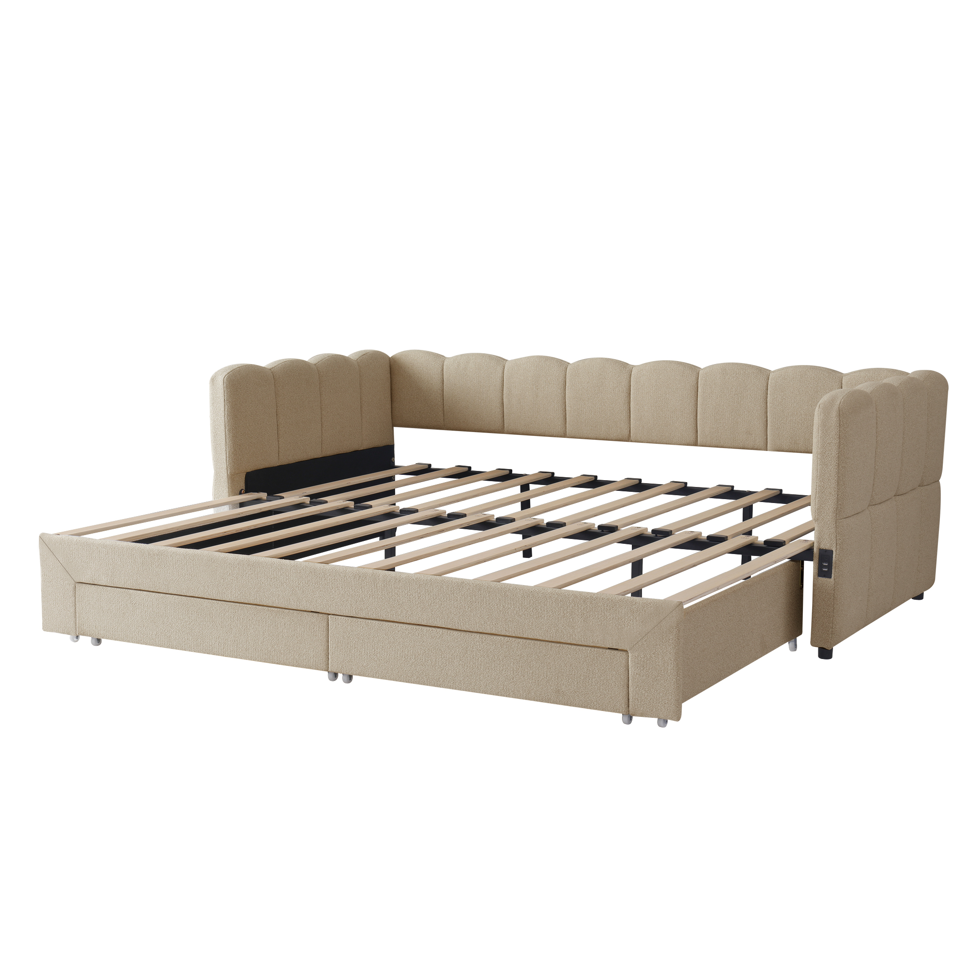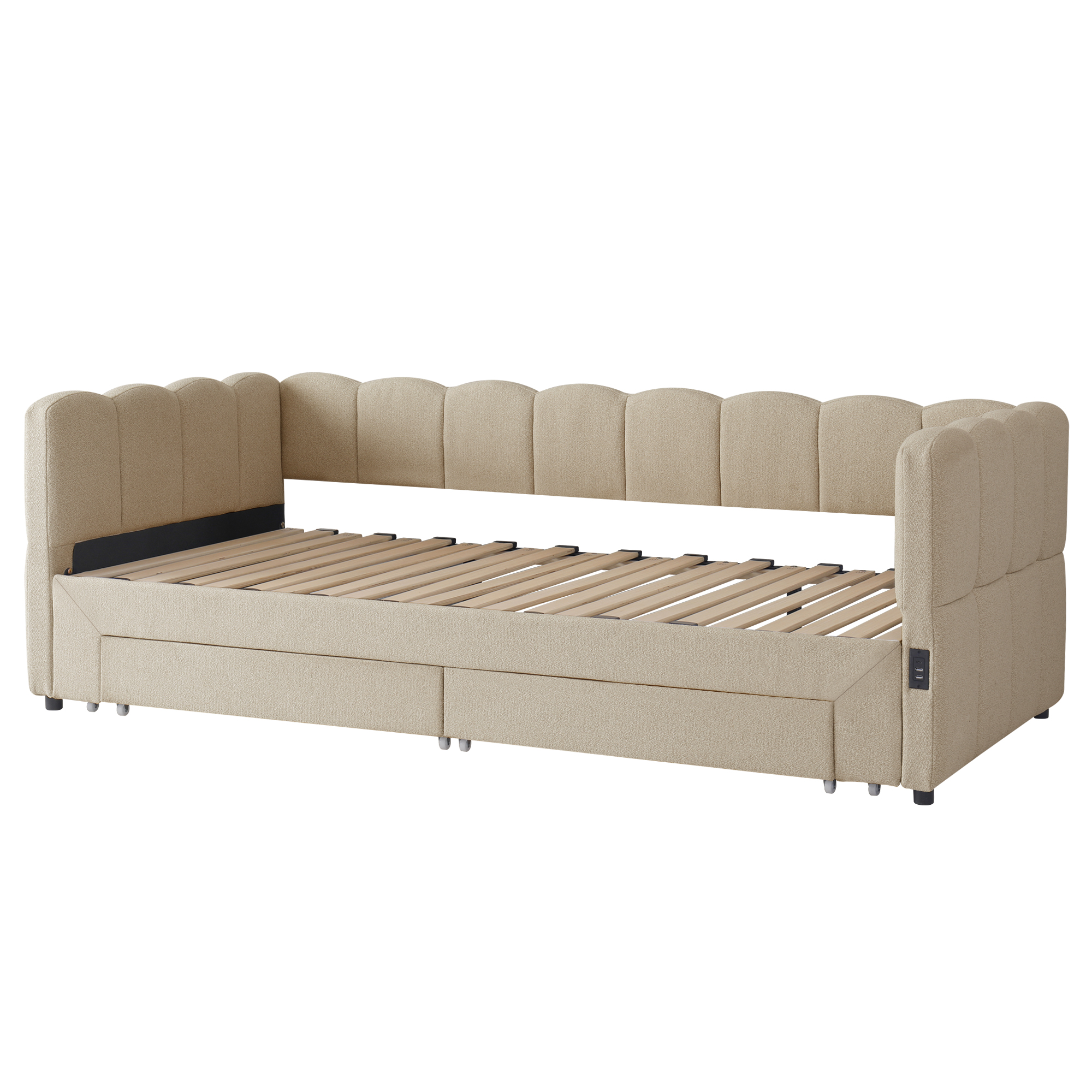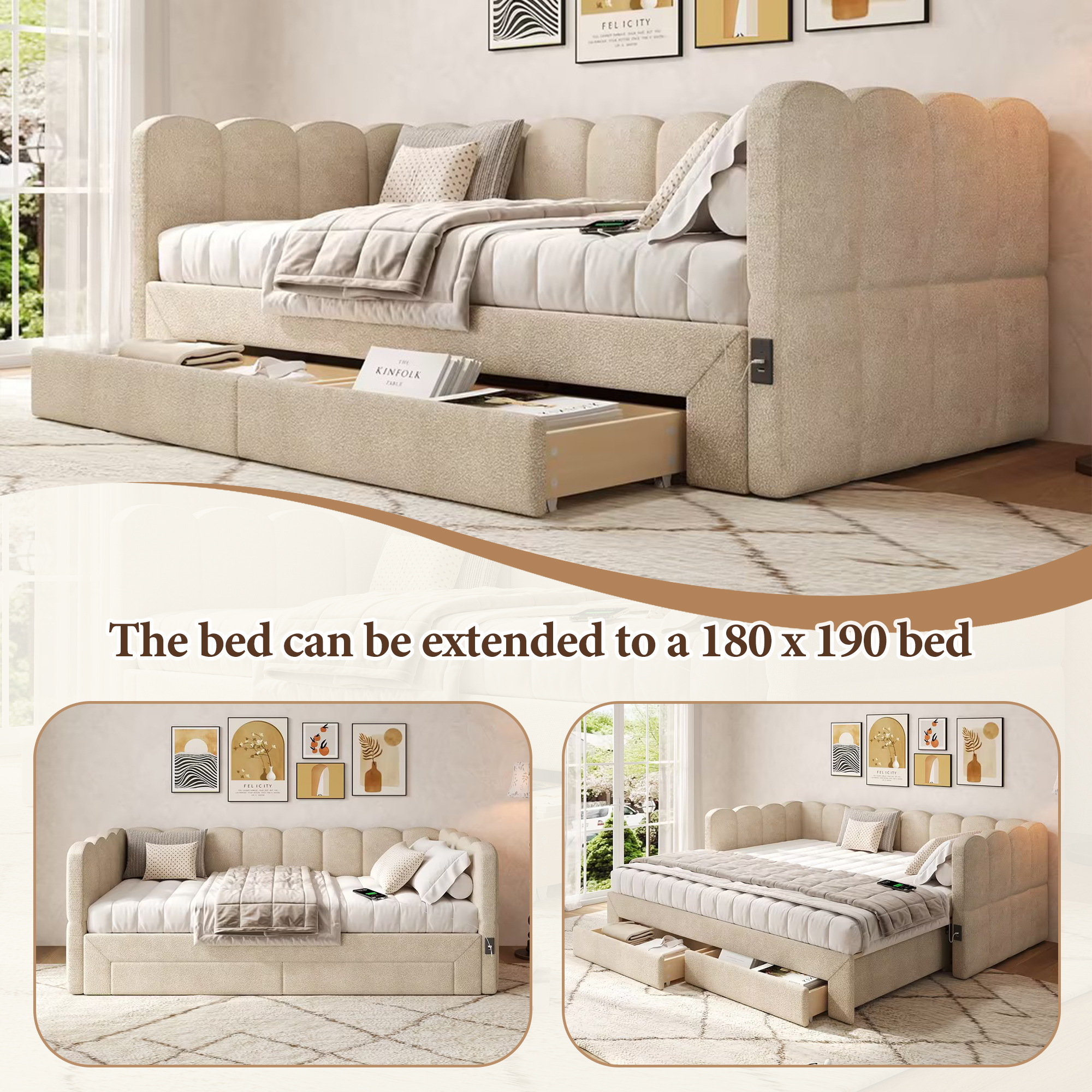 Product Name:Upholstered bed, daybed, sofa bed, with 2 drawers for storage, sofa bed, daybed 90x190 cm, extendable to 180 cm, with USB port, beige chenille