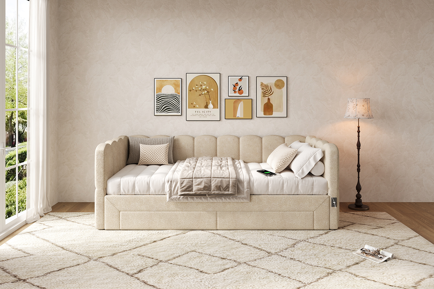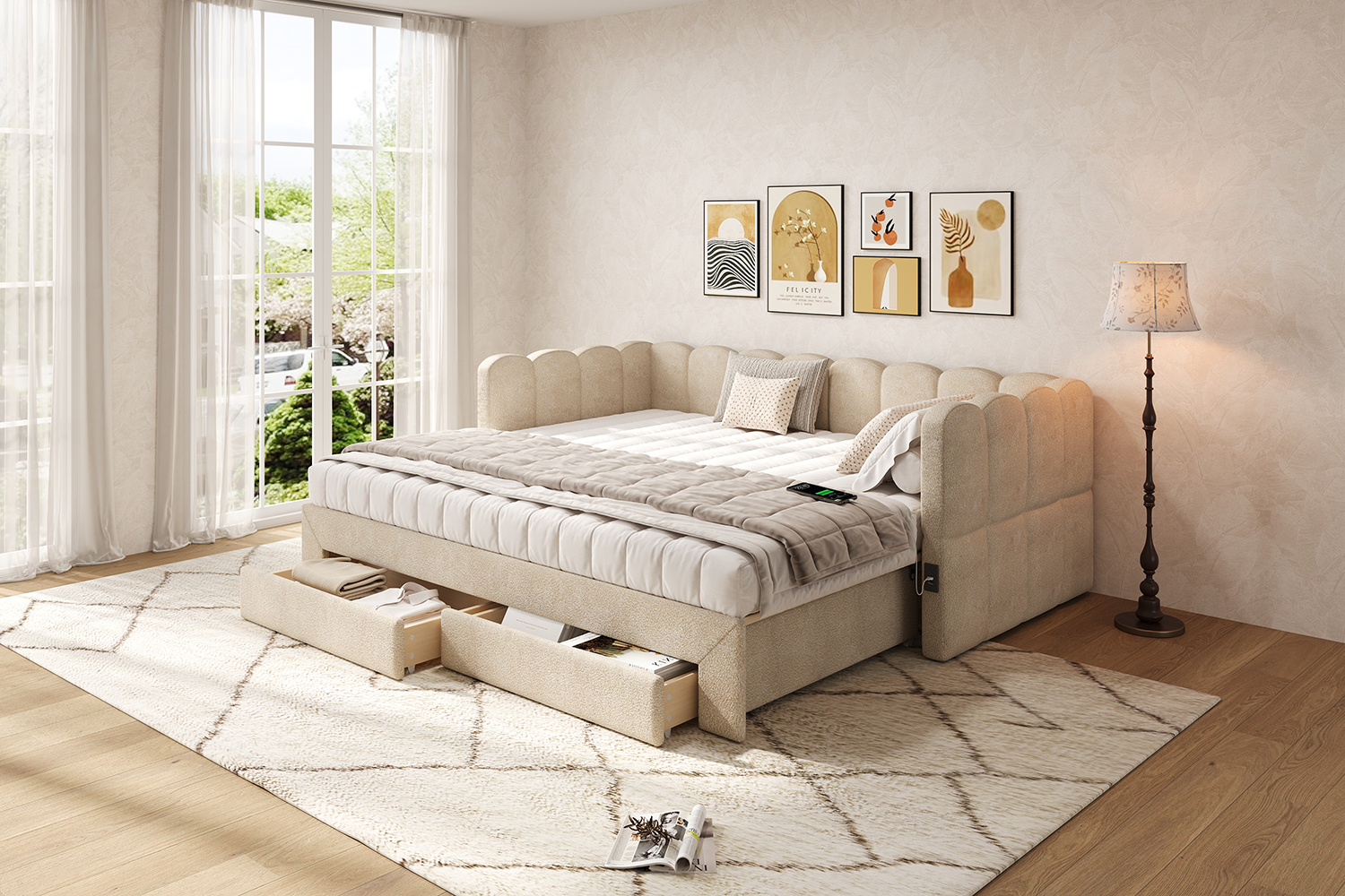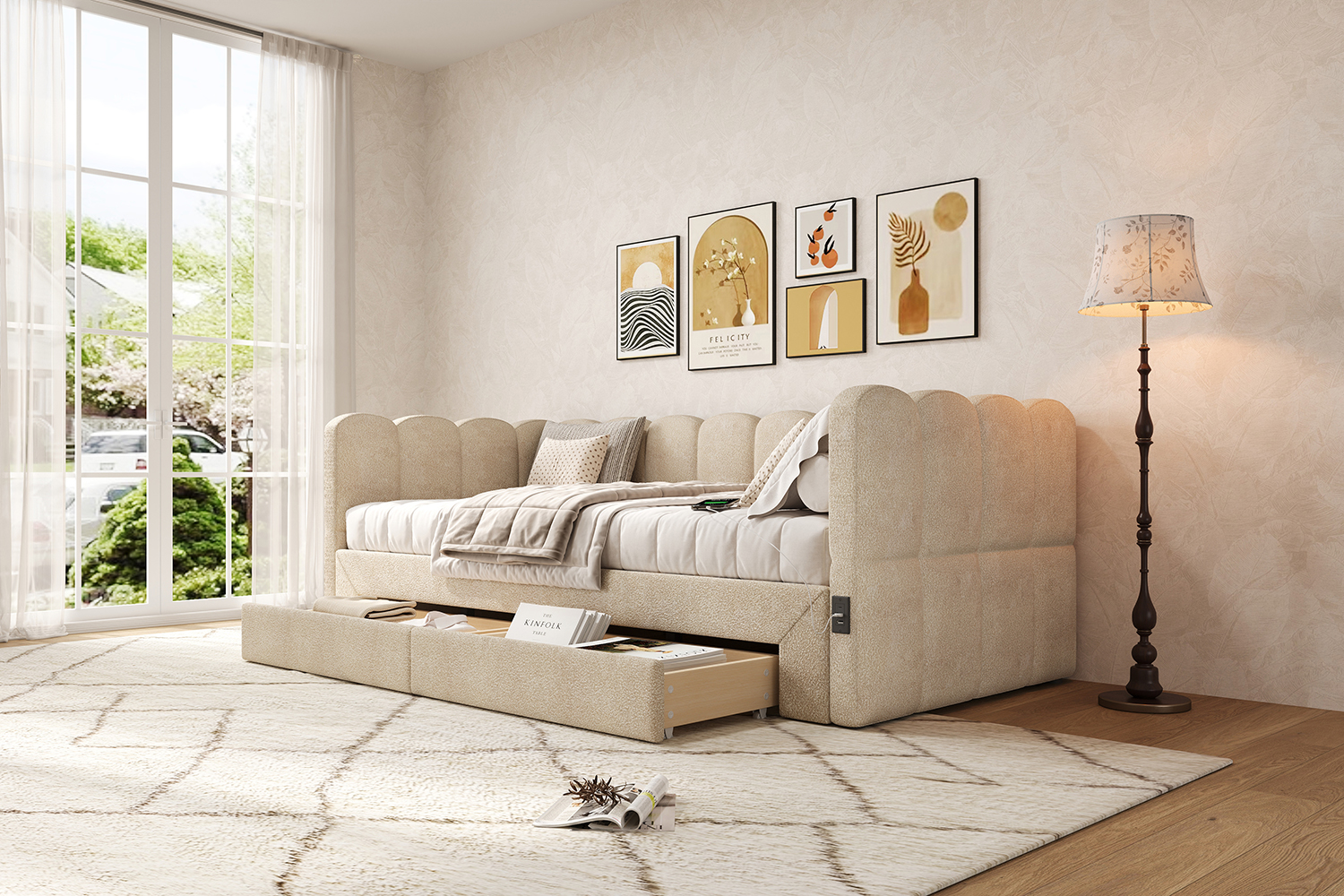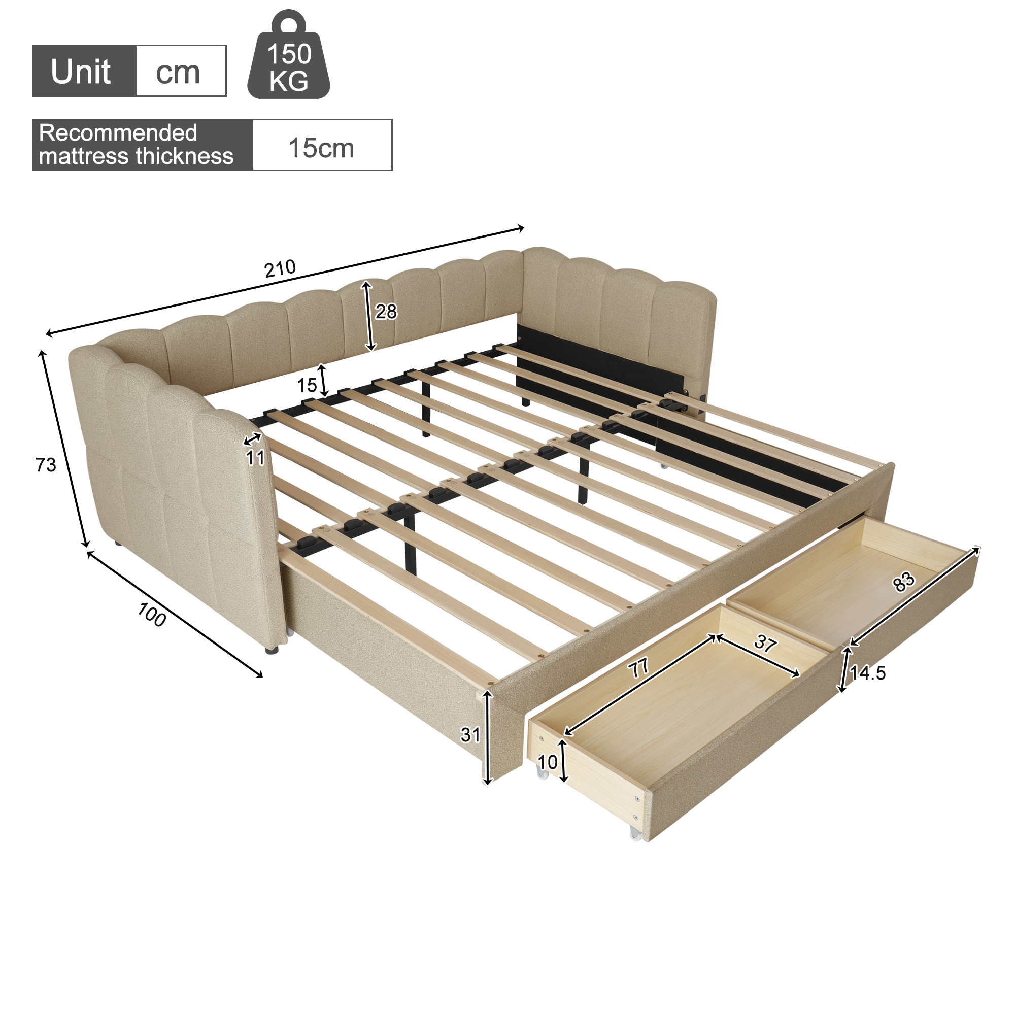 Product Name:Upholstered bed, daybed, sofa bed, with 2 drawers for storage, sofa bed, daybed 90x190 cm, extendable to 180 cm, with USB port, beige chenille