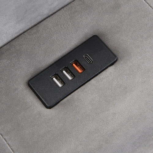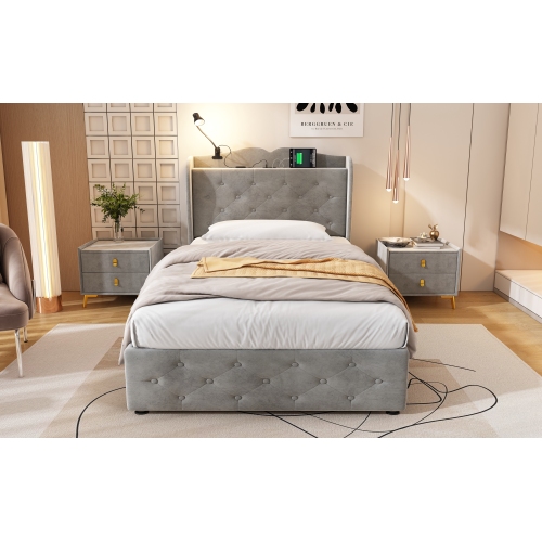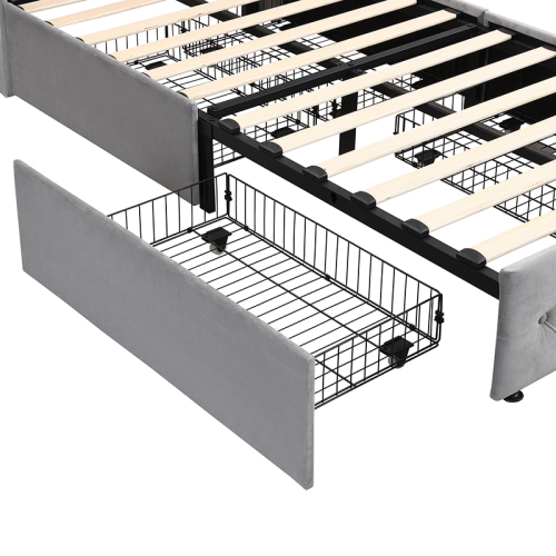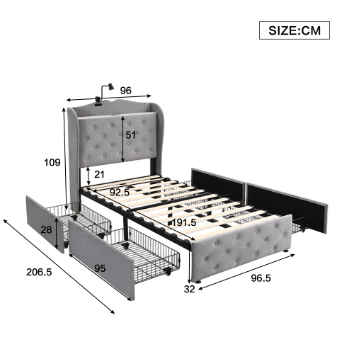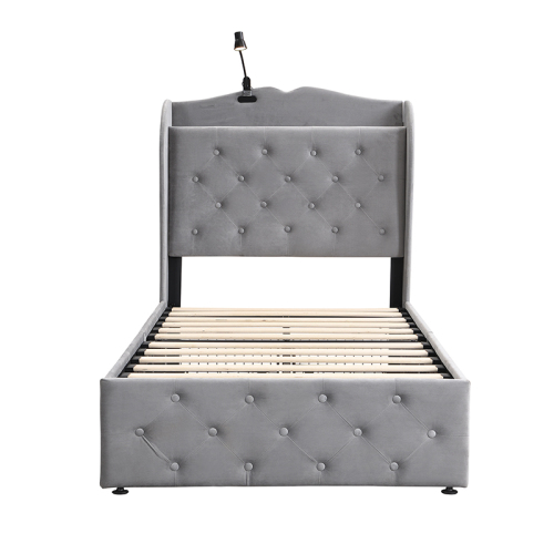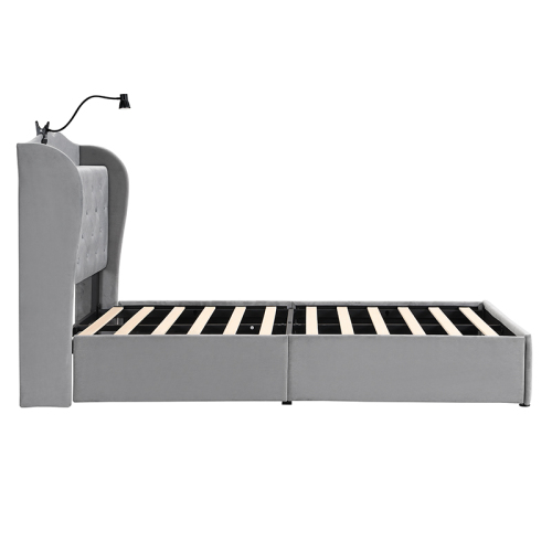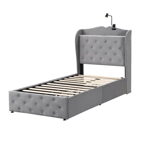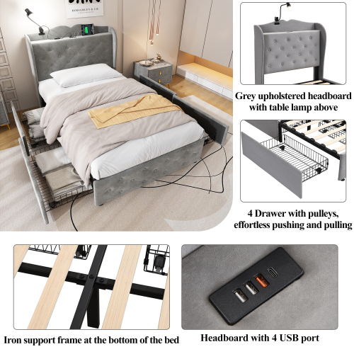 1.Portable Table Lamp 2.Grey velvet fabric + foam padding 3.Headboard with 4 charging ports 4.4 drawers under the bed, each with four universal wheels 5.Plenty of storage space
