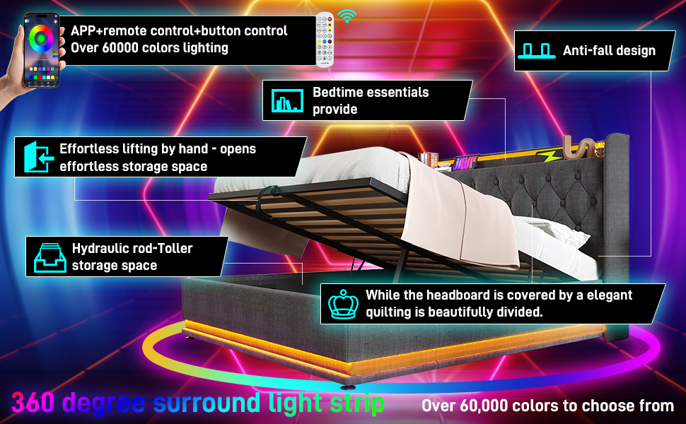 | Unique Design | 360 surround LED function USB+TypeC Charging function headboard |