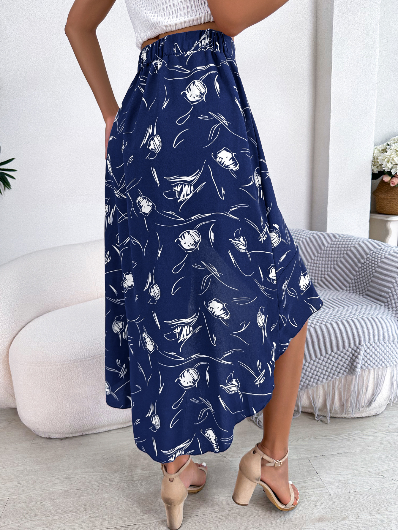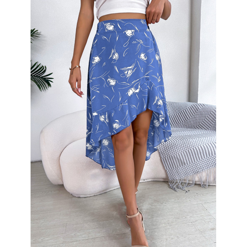 Women Casual Floral Print Asymmetric Ruffle Midi Skirt