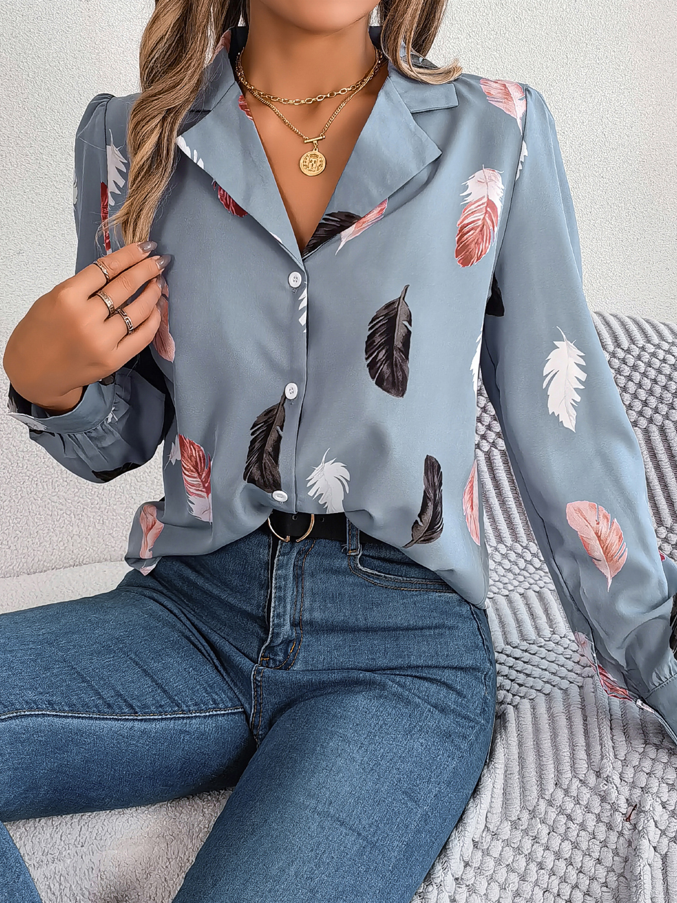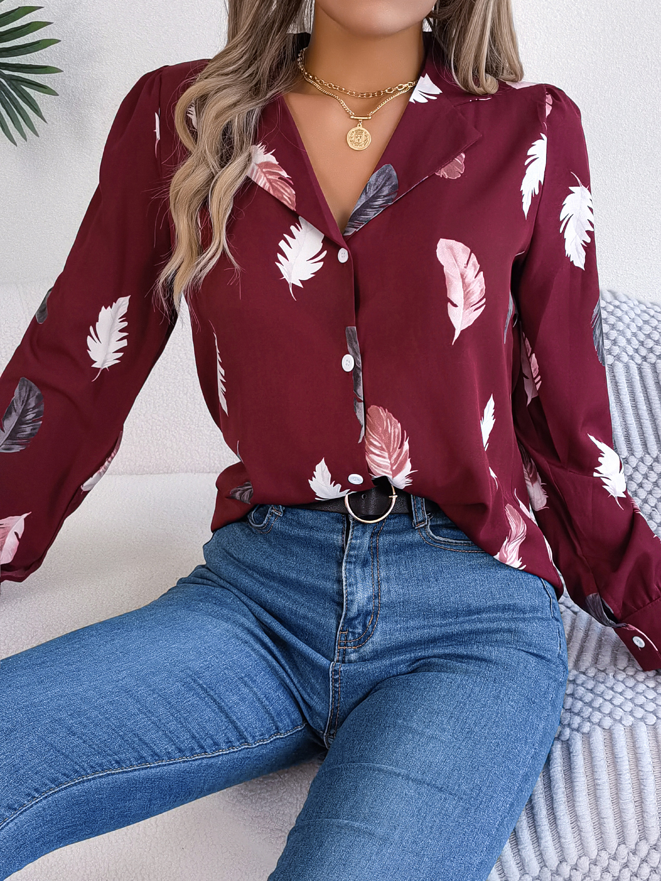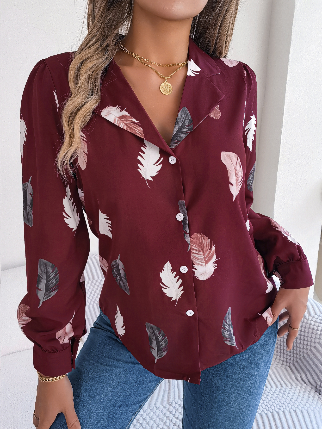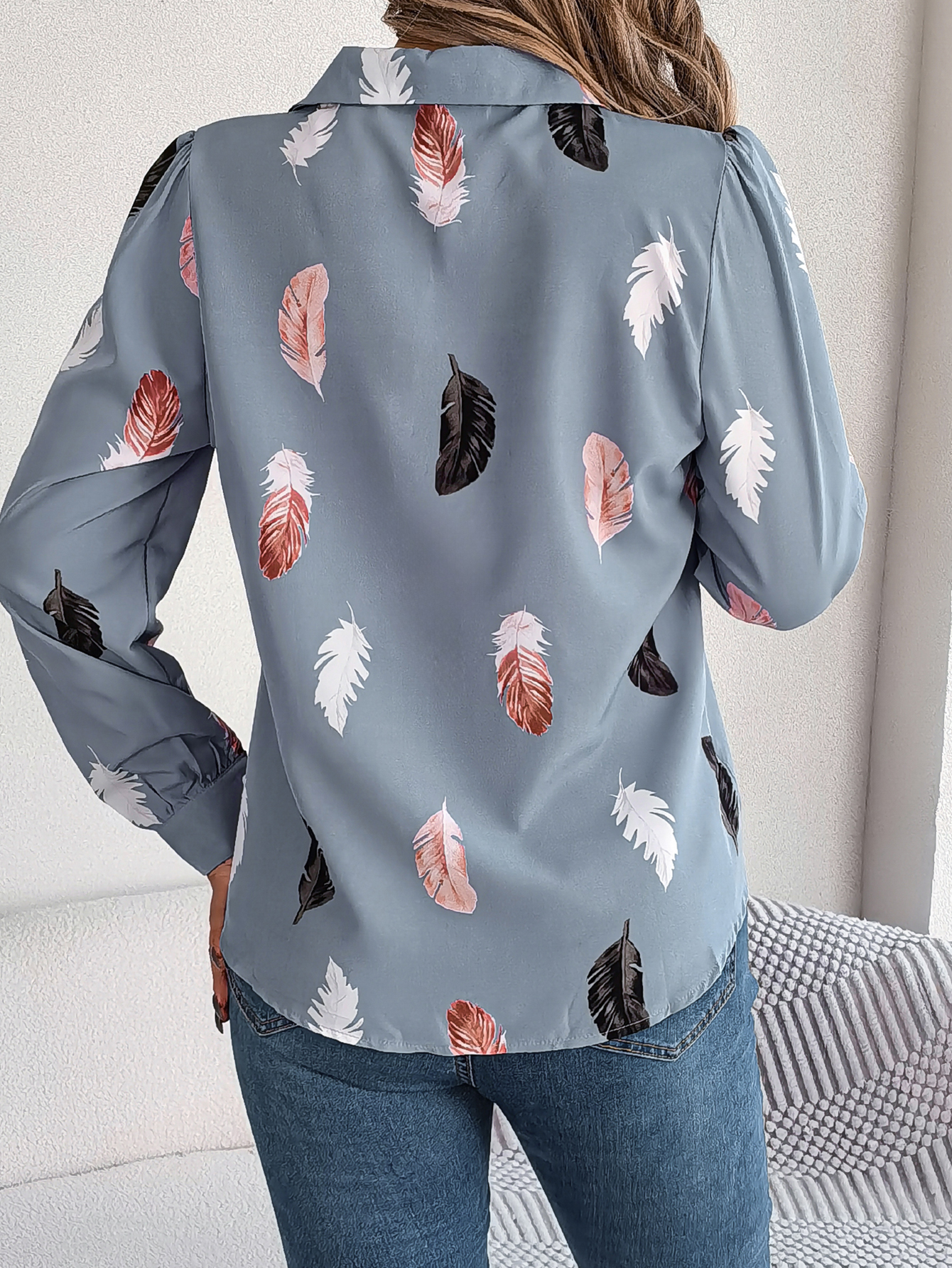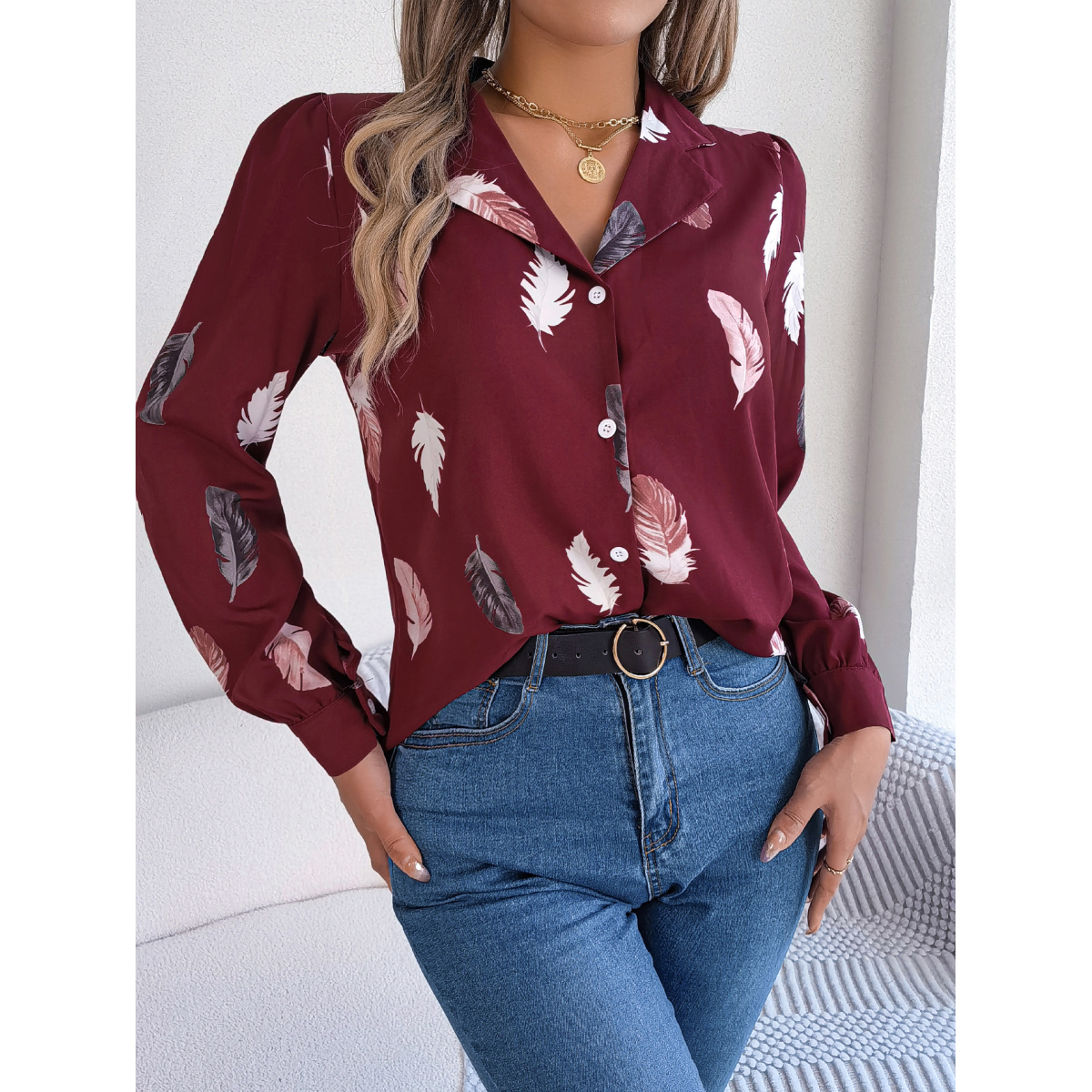 Women's Elegant Feather Print Notched Lapel Long Sleeve Shirt