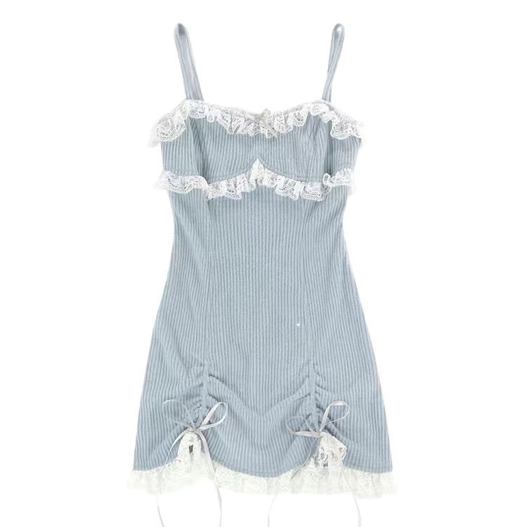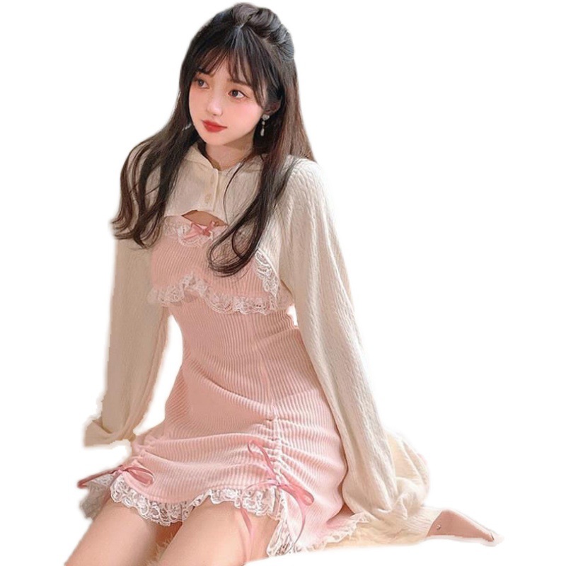 Color: white hooded top, pink suspender skirt, blue suspender skirt