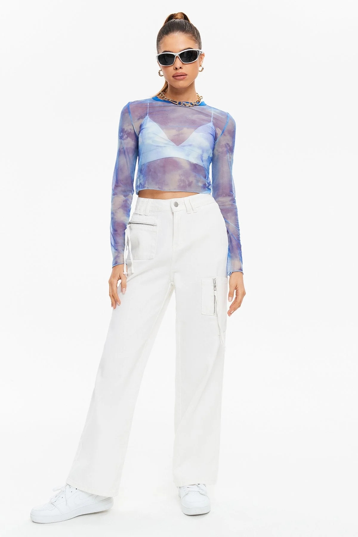 Women's Round Neck Exposed Navel Long -sleeved Mesh Printed Tops