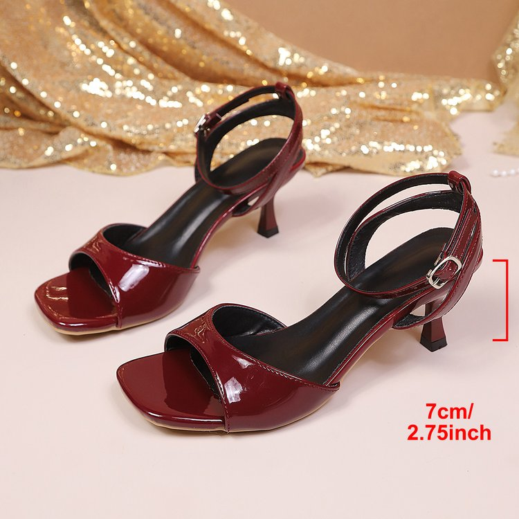 Elevate your everyday look with these chic square-toe heeled sandals. Featuring a sleek square toe, a delicate adjustable ankle strap with a gold buckle, and a slender mid heel, these glossy wine-red sandals offer effortless style and a subtle height boost. Perfect for adding a touch of timeless elegance to date nights, office wear, parties, or casual daily use.
