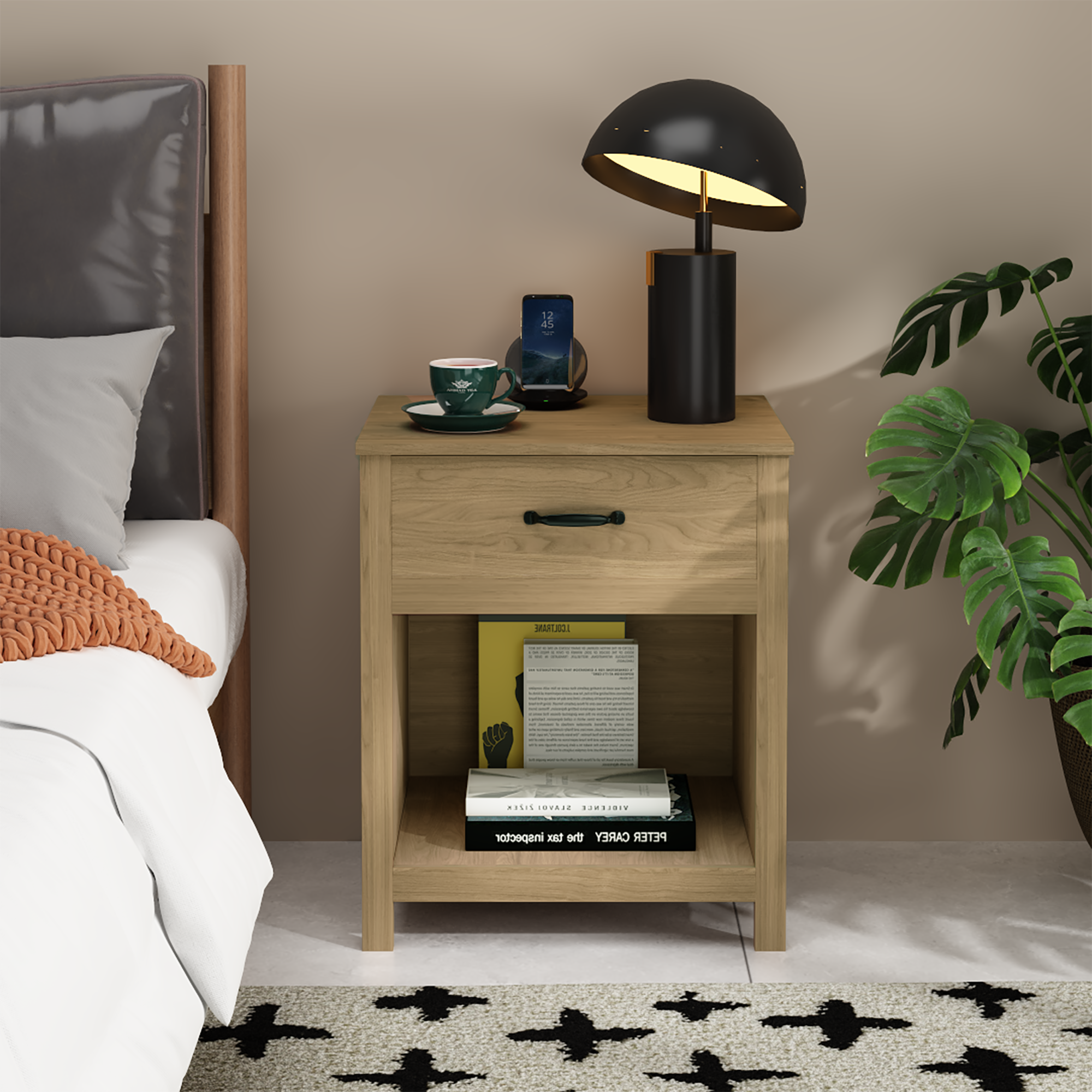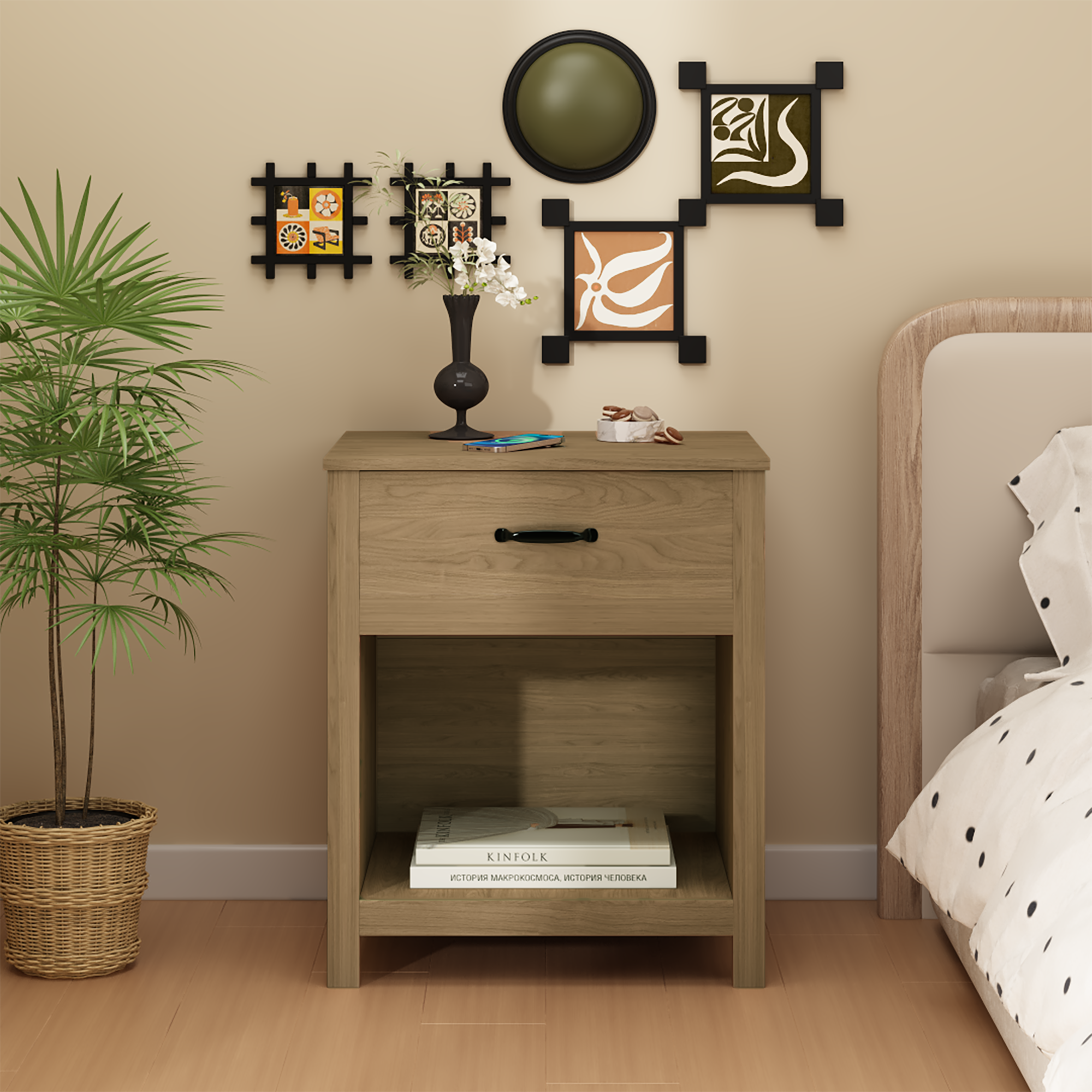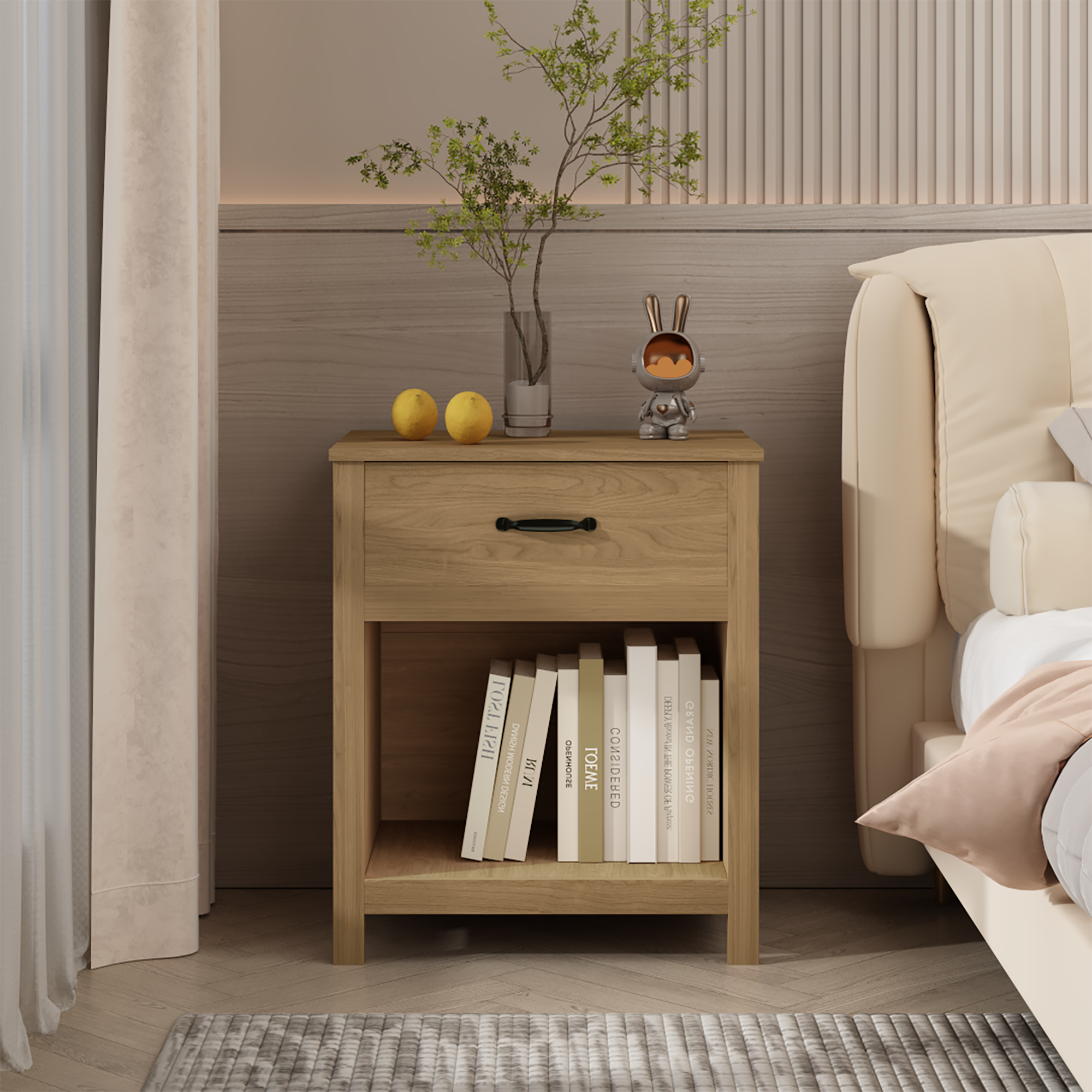Product Name:Wood Nightstand with Drawer and Open Shelf, Modern Bedside Table with Storage, Wooden End Table for Bedroom, Living Room or Apartment, Natural Finish, Brown