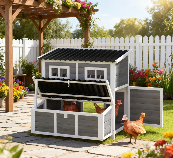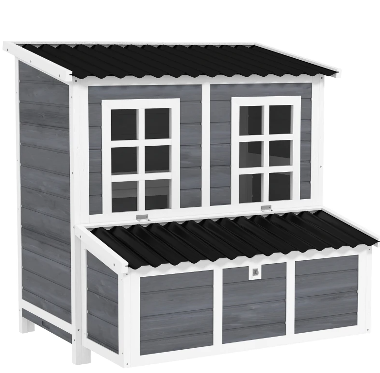 Features: - Large living space provides a lot of room for chicken comfort - Nesting box with latches secures eggs safely - Doors and convertible ramp facilitate free chicken movement - Waterproof paint and elevated design enhance durability - Easy cleaning with pull-out tray feature - Observation windows allow monitoring without disturbance - Roosting bars offer comfortable sleeping space - Suitable for keeping 4-6 chickens Specification: - Color: Light Gray - Material: Fir Wood, Plastic - Overall Dimensions: 39.4" L x 33.9" W x 39.4" H - Main House: 36.2" x 19.7" W x 35.6" H, 4 sq.ft. - Nesting Box: 33.9" L x 11.8" W x 14" H, 2 sq.ft. - Front Door: 11.2" W x 15.2" H - Side Door: 17.1" W x 18.3" H - Window: 10.6" W x 13.8" H - Tray: 35.4" L x 17.1" W - Perch: 11.8" W x 9.1" D - Feet Height: 2.4" H Package Includes: - 1 x Chicken Coop - 1 x Nesting Box - 1 x Tray - 1 x Roosting Bars - 1 x Manual