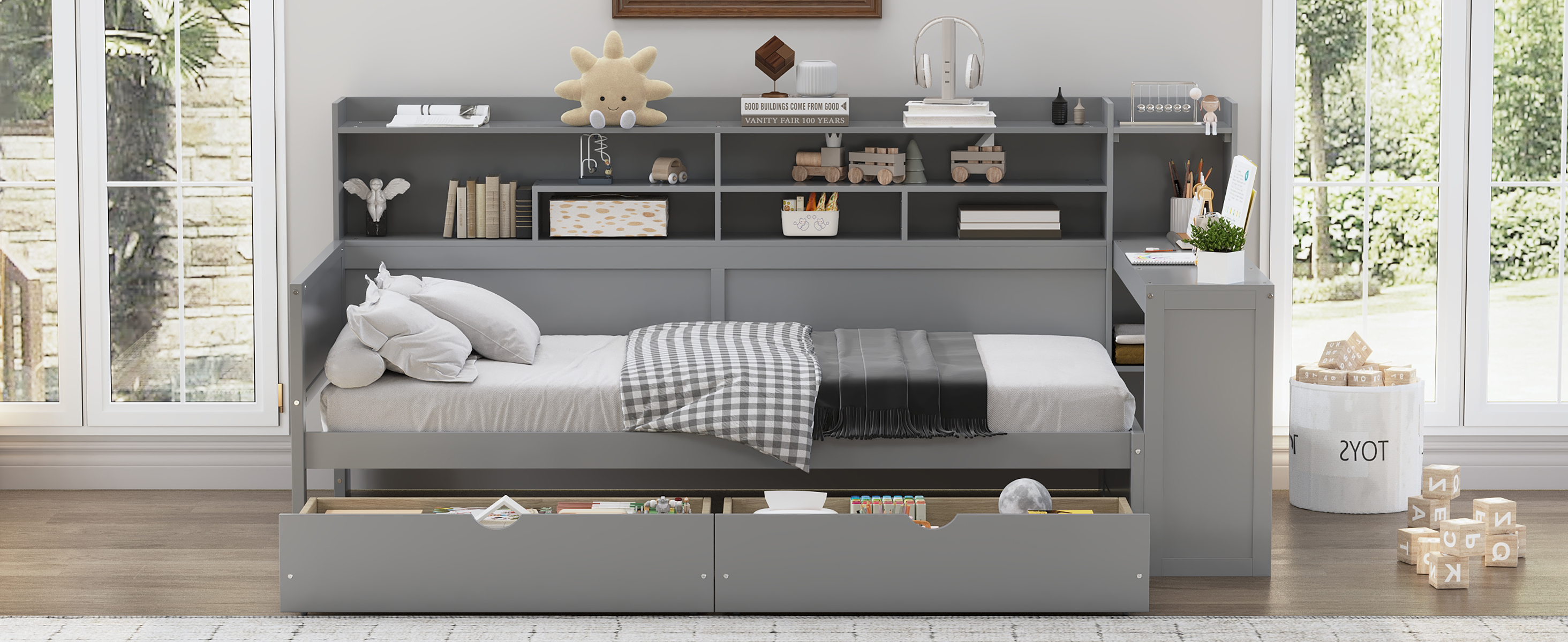 Product Name:Wooden Twin Size Daybed with Storage Shelves, Multi-functional Bed with Two Storage Drawers and Study Desk, Gray